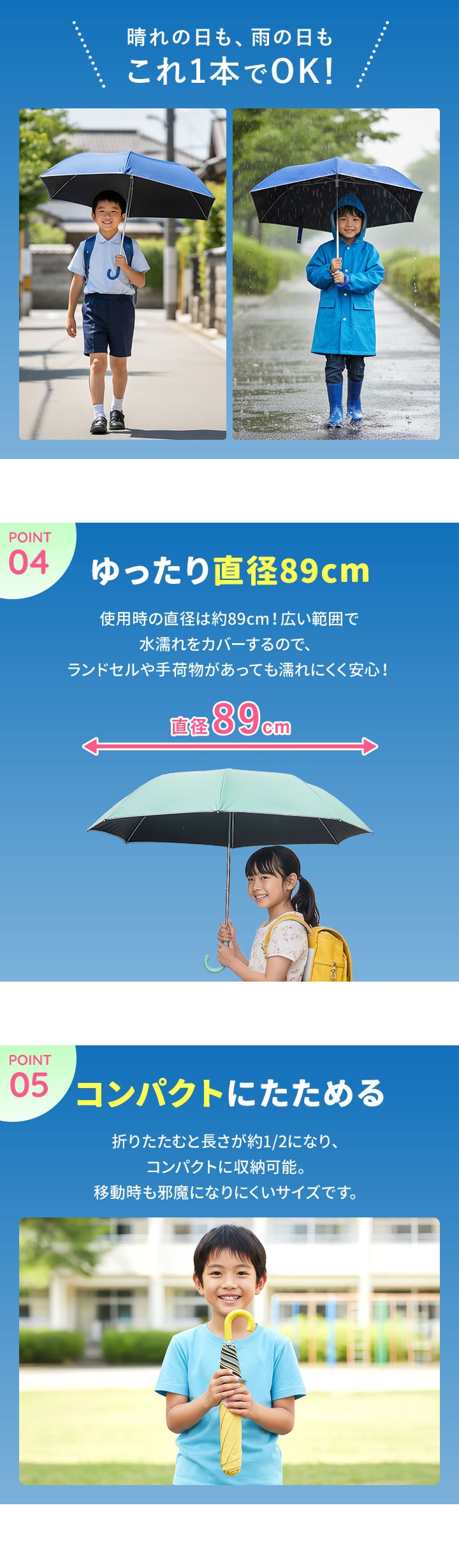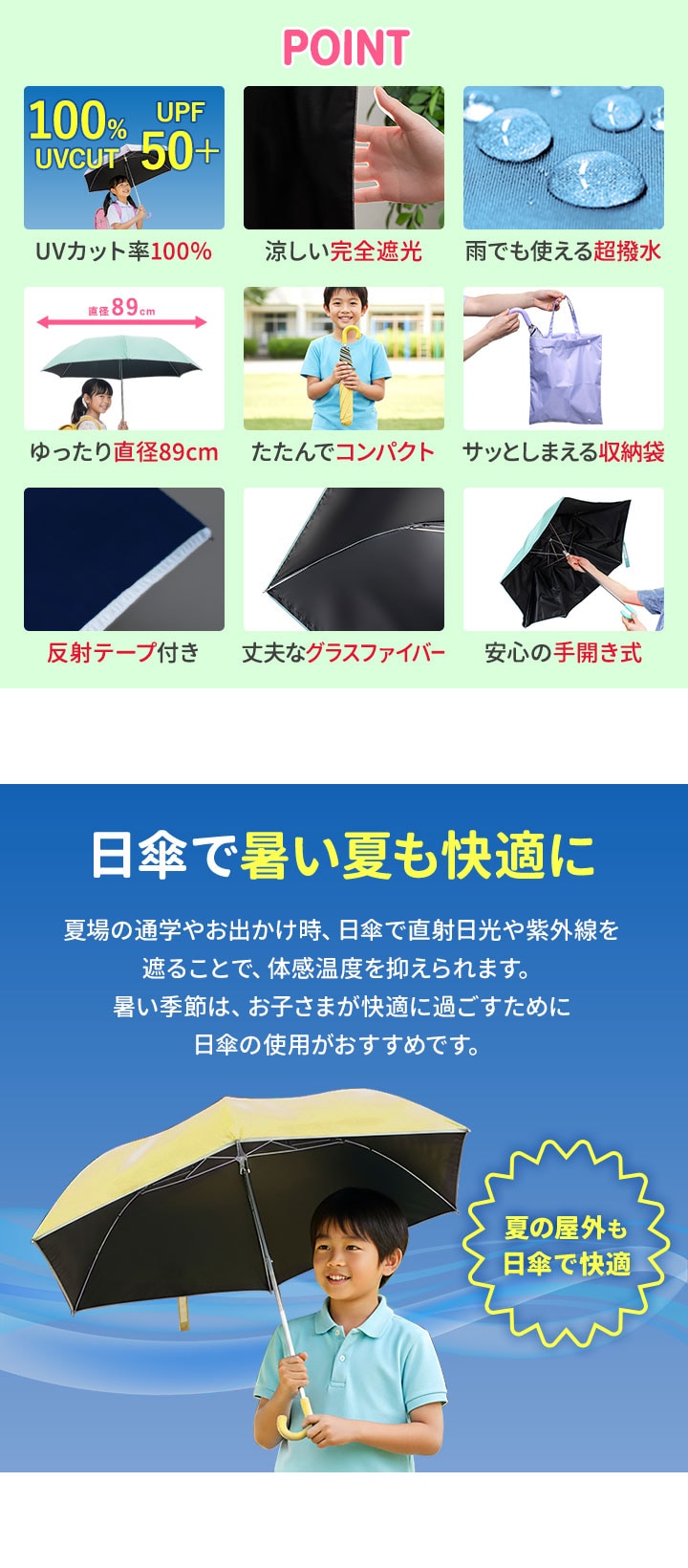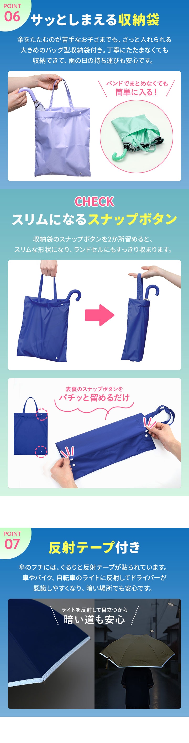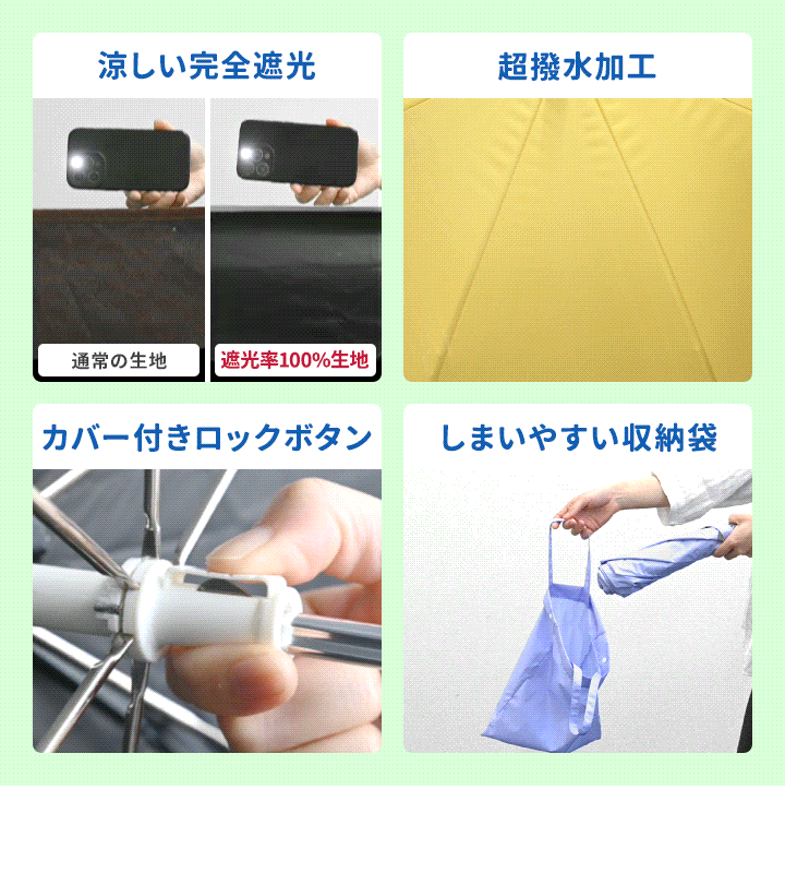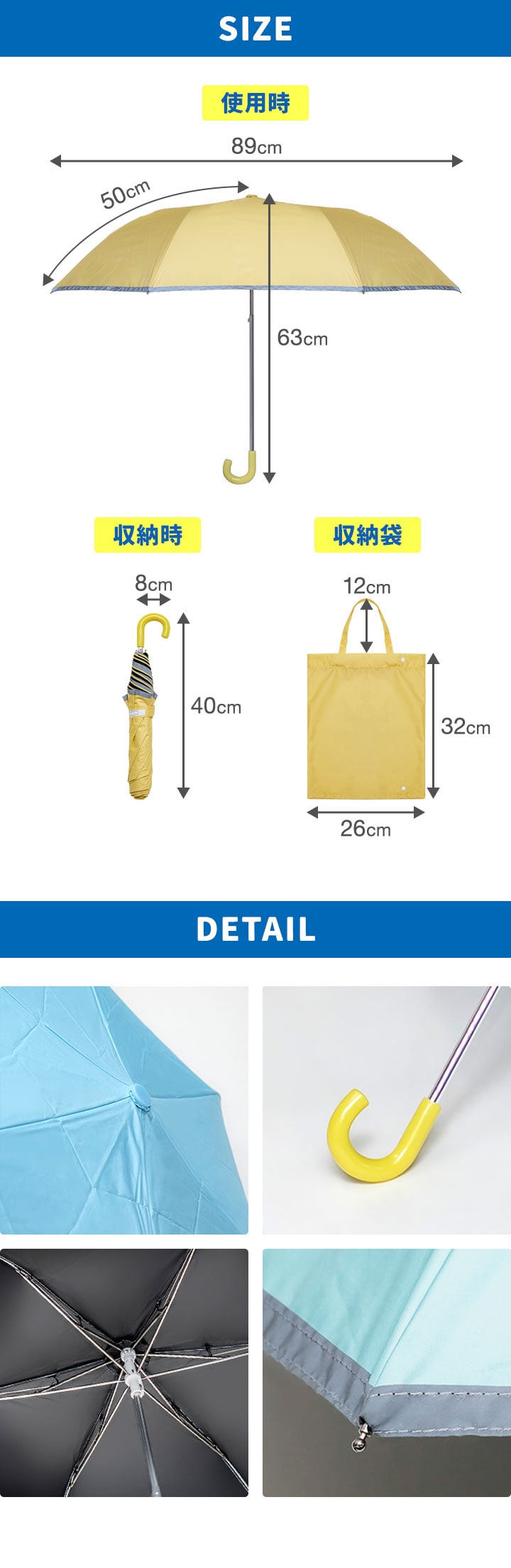 | サイズ: 親骨:50cm 使用時:(約)直径89cm×長さ63cm 収納時:(約)幅8cm×長さ40cm 収納袋:(約)幅26cm×高さ32cm |
