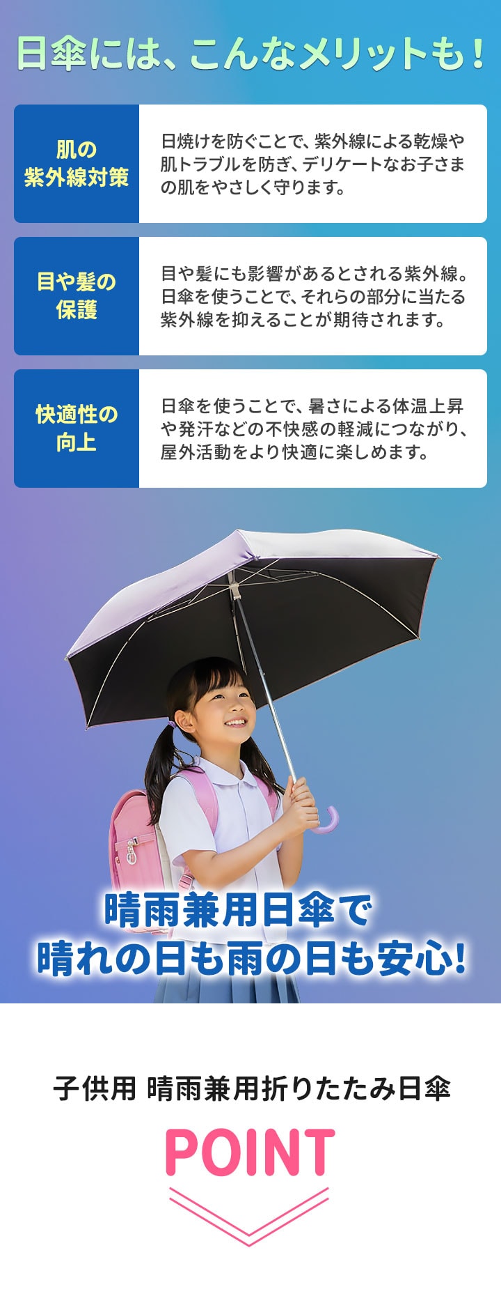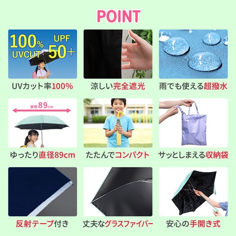 子ども用 折りたたみ傘 晴雨兼用 (パープル) キッズ傘 50cm 完全遮光 遮熱 UVカット 日傘 雨傘 男の子 女の子 子供用 軽量 コンパクト 指をはさまない かんたん 収納袋付き 安全 反射テープ付き 超撥水 丈夫 小学生 通学 通園 紫外線対策 熱中症対策 送料無料