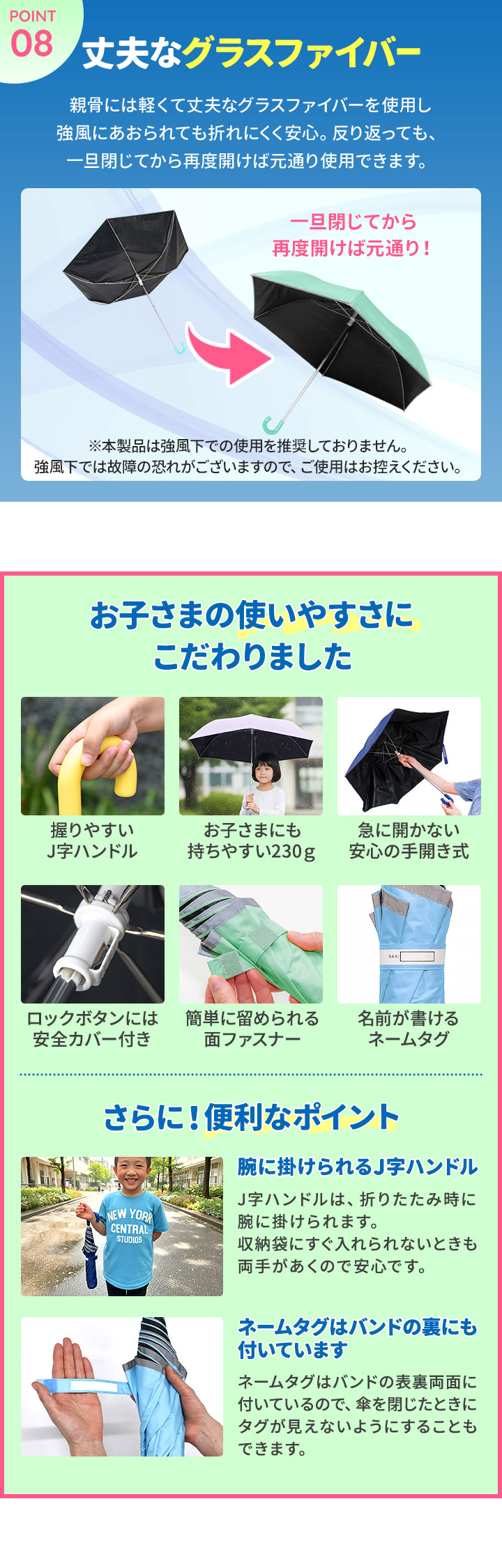| 特記事項: ※商品の布地には撥水加工を施しておりますが、激しい雨の際は、雨水が傘生地にしみる事があります、ご了承ください。 また強風時は破損する恐れがありますので使用をお控えください。 ※雨天時の使用後は傘を広げて十分に湿気を取り除いてください。湿ったまま保管しますと、金属部分の錆の原因となります。 |