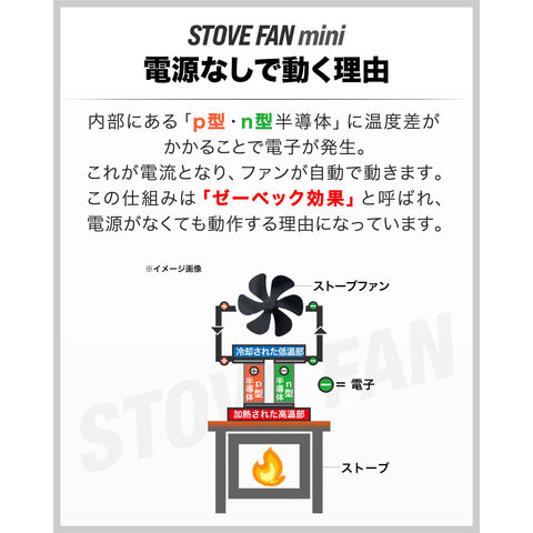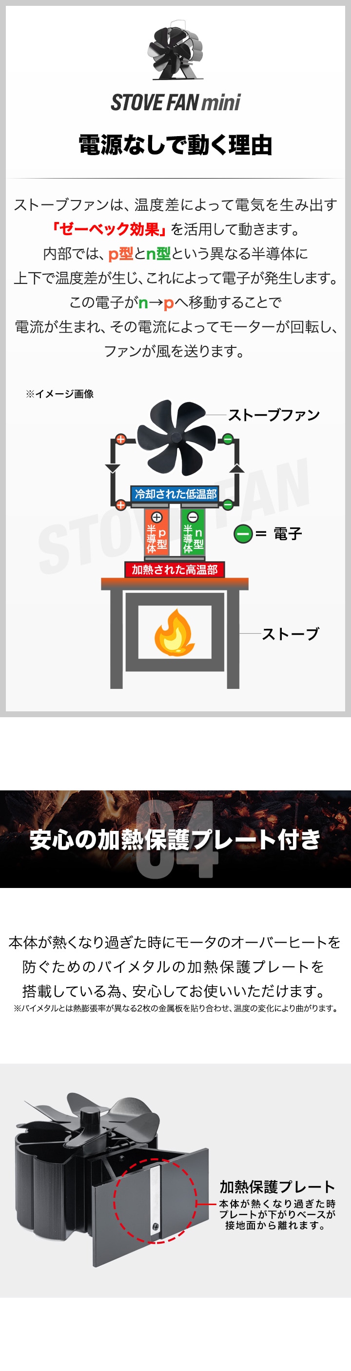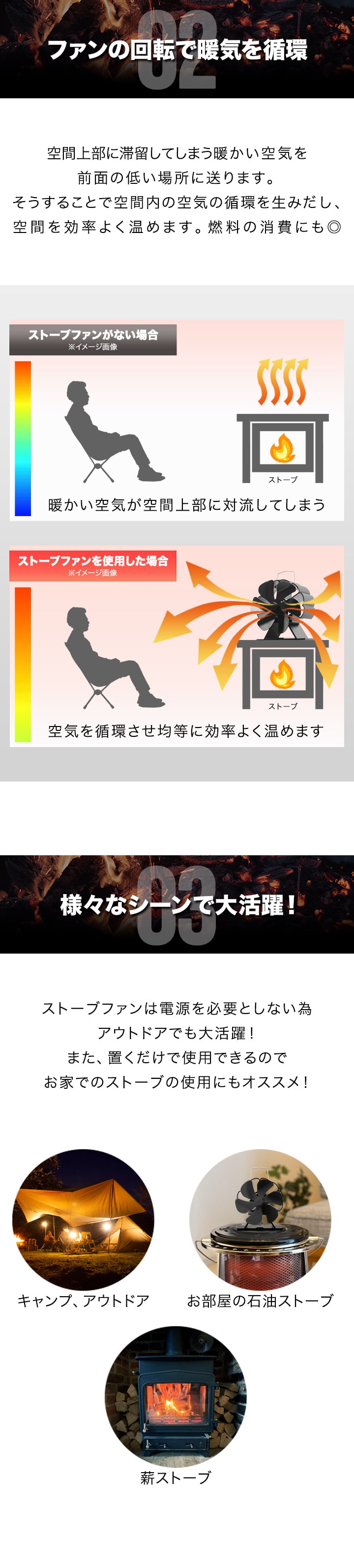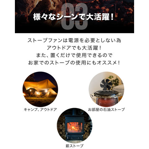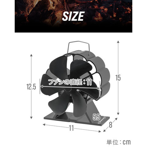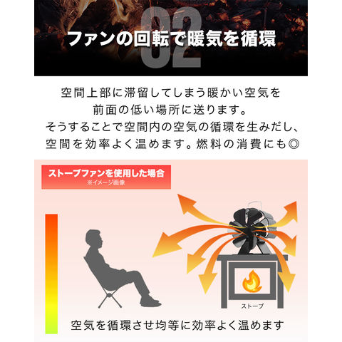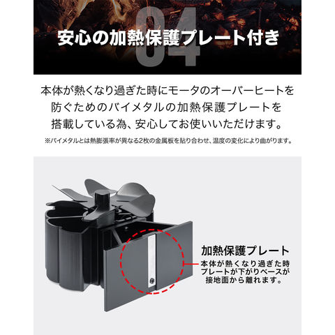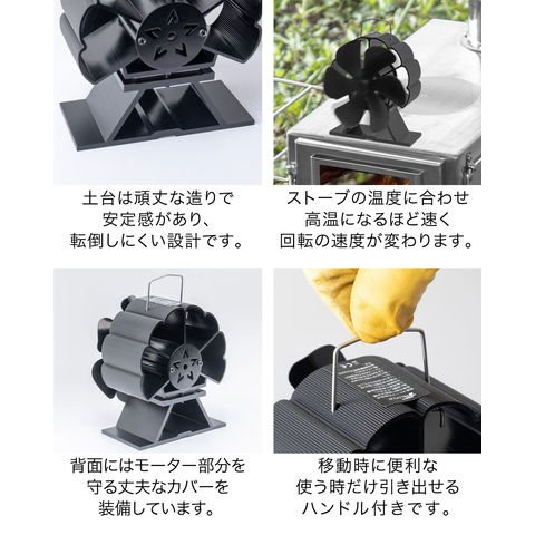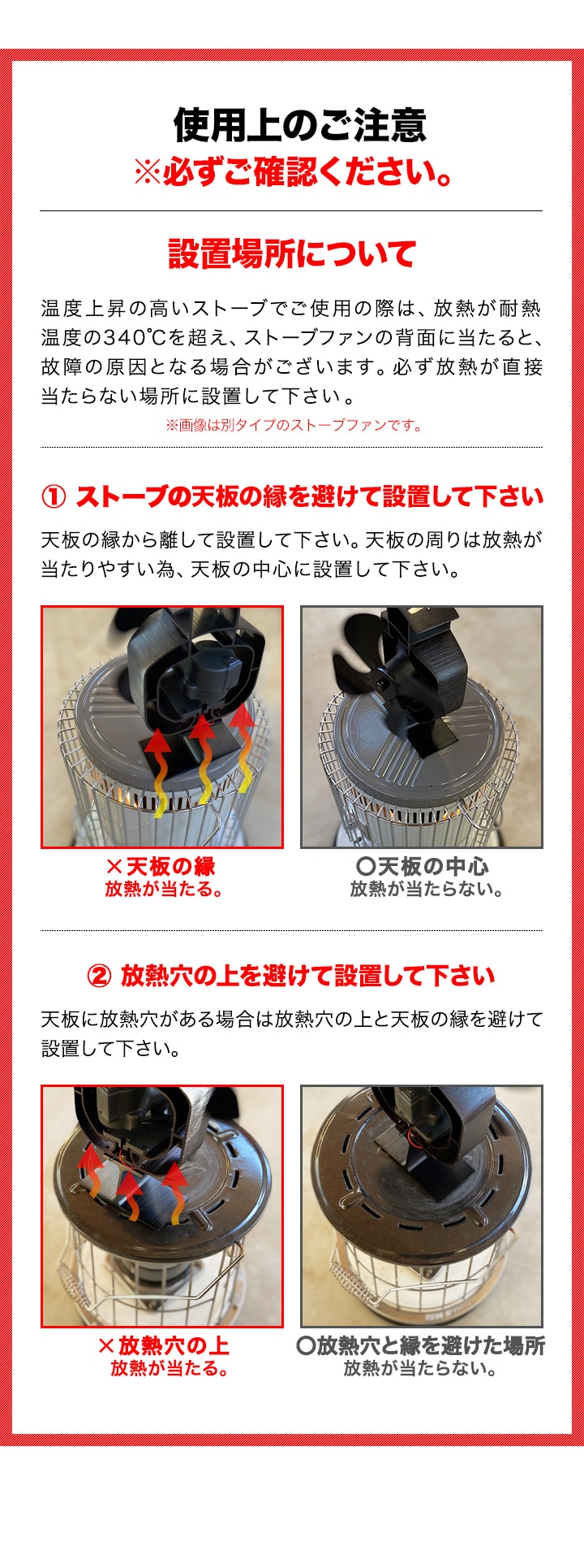 | 特記事項: ・ご使用後は本体が非常に熱くなっています。移動させる際は必ず手袋を着用してください。 ・作動中は羽根に触れないように気をつけてください。 ・ストーブの表面の温度が340℃以上になっている場合はご使用をおやめください。 ・煙突ストーブの場合は煙突の前に設置せず側面に設置してください。 |