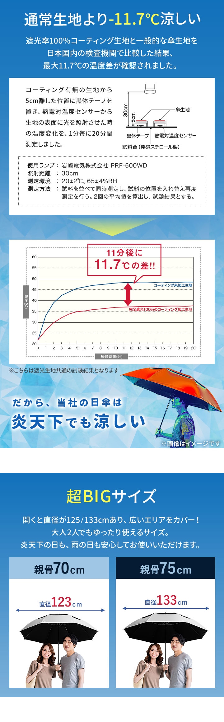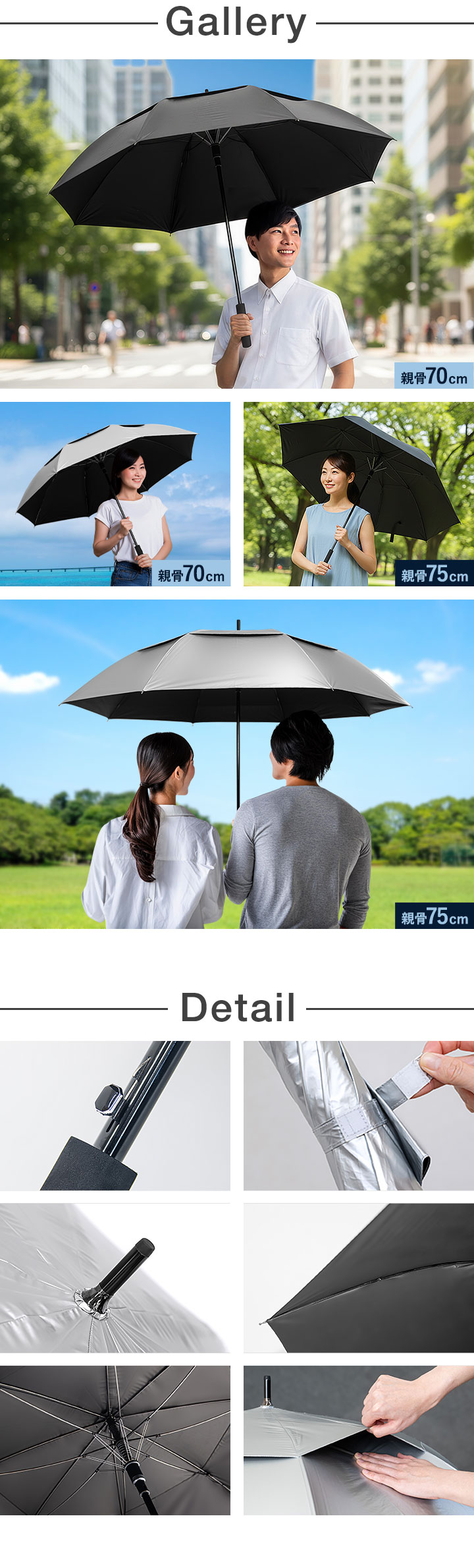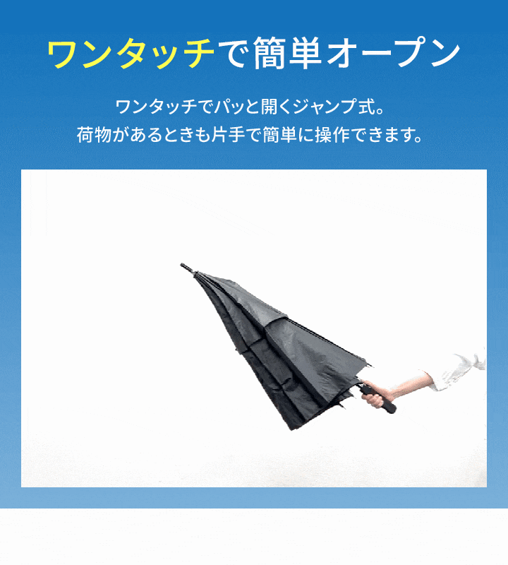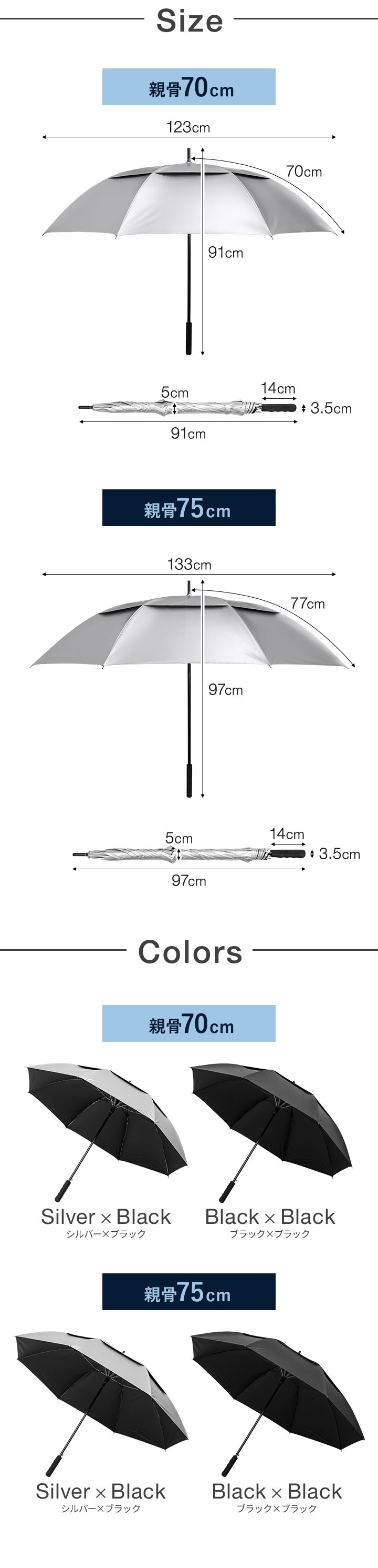 | サイズ: 【親骨:70cm】 使用時:(約)直径123cm×長さ91cm 収納時:(約)直径5cm×長さ91cm 【親骨:75cm】 使用時:(約)直径133cm×長さ97cm 収納時:(約)直径5cm×長さ97cm |