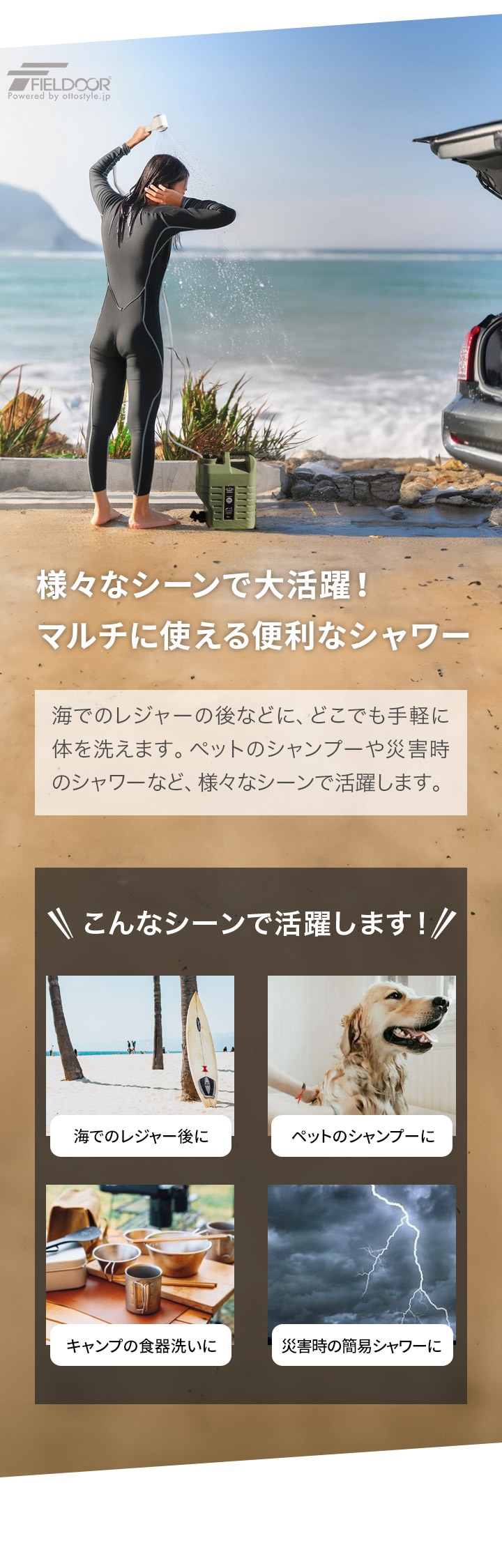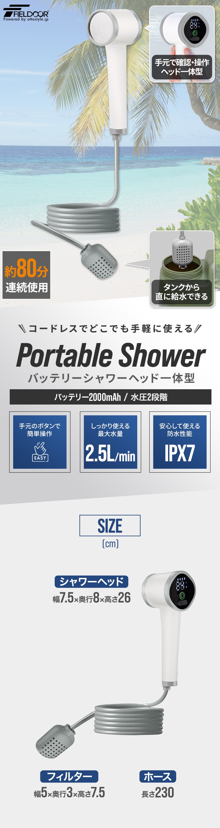 FIELDOOR ポータブルシャワー 電動シャワー 簡易シャワー USB充電式 2000mAh 電動ポンプ 温水対応 シャワーヘッド一体型 連続使用80分 アウトドアシャワー 携帯シャワー 海水浴 サーフィン マリンスポーツ アウトドア キャンプ 釣り 送料無料