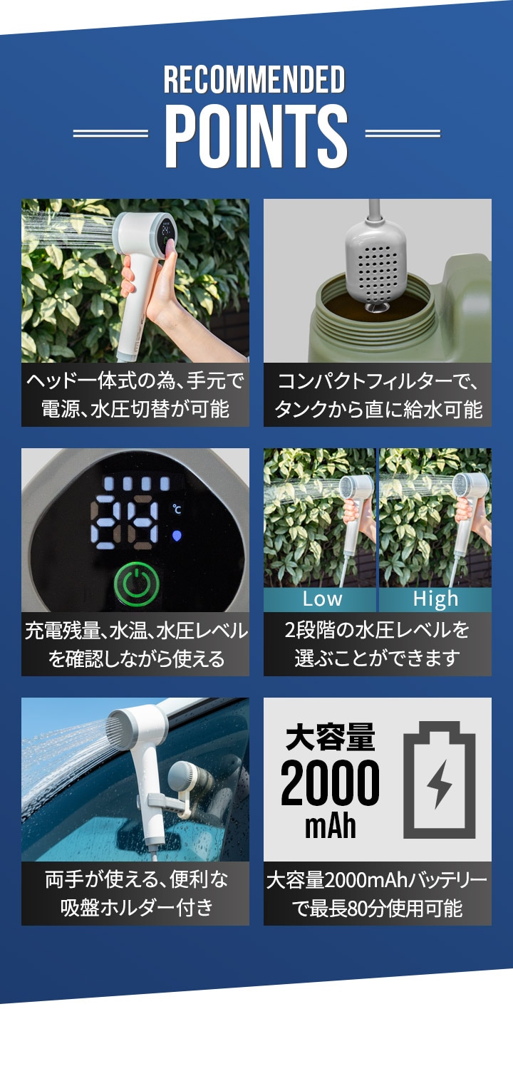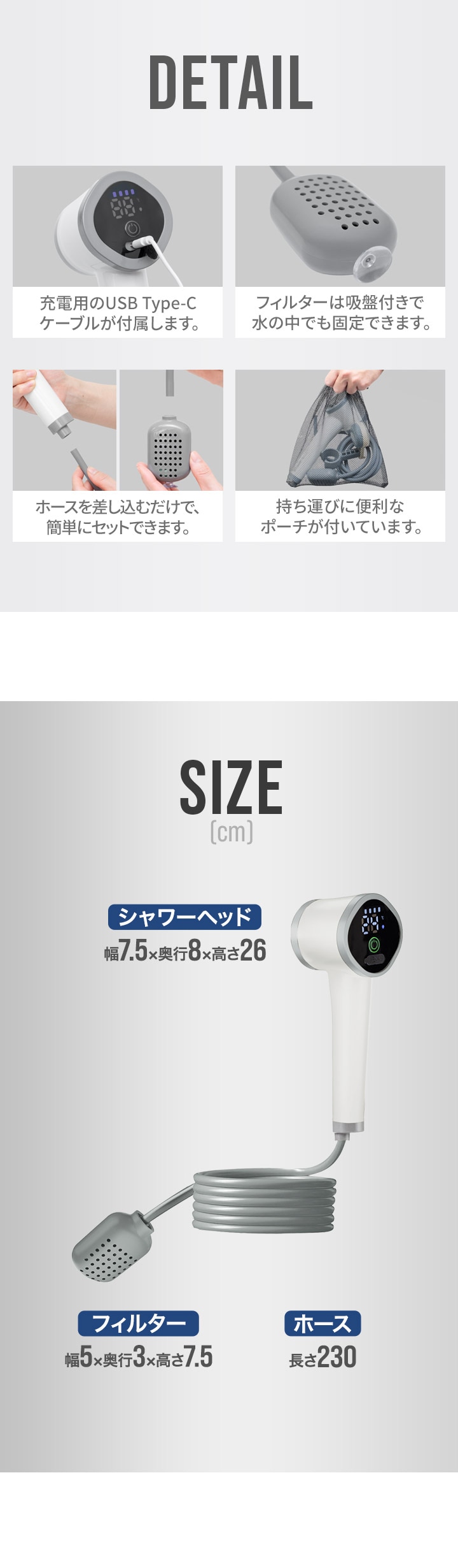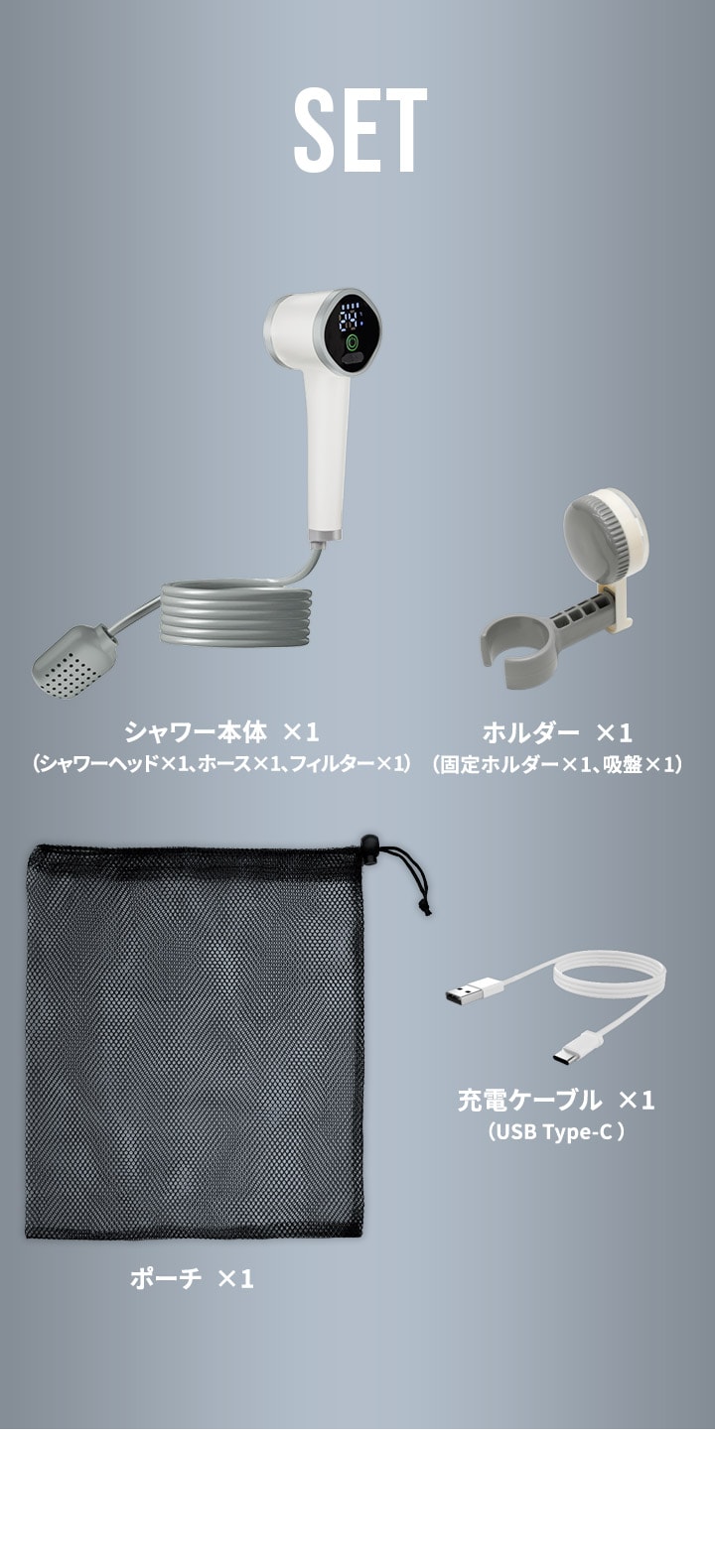 | 付属品: シャワーヘッド、ホース、フィルター、固定ホルダー、吸盤、収納ポーチ、USB Type-C充電ケーブル |