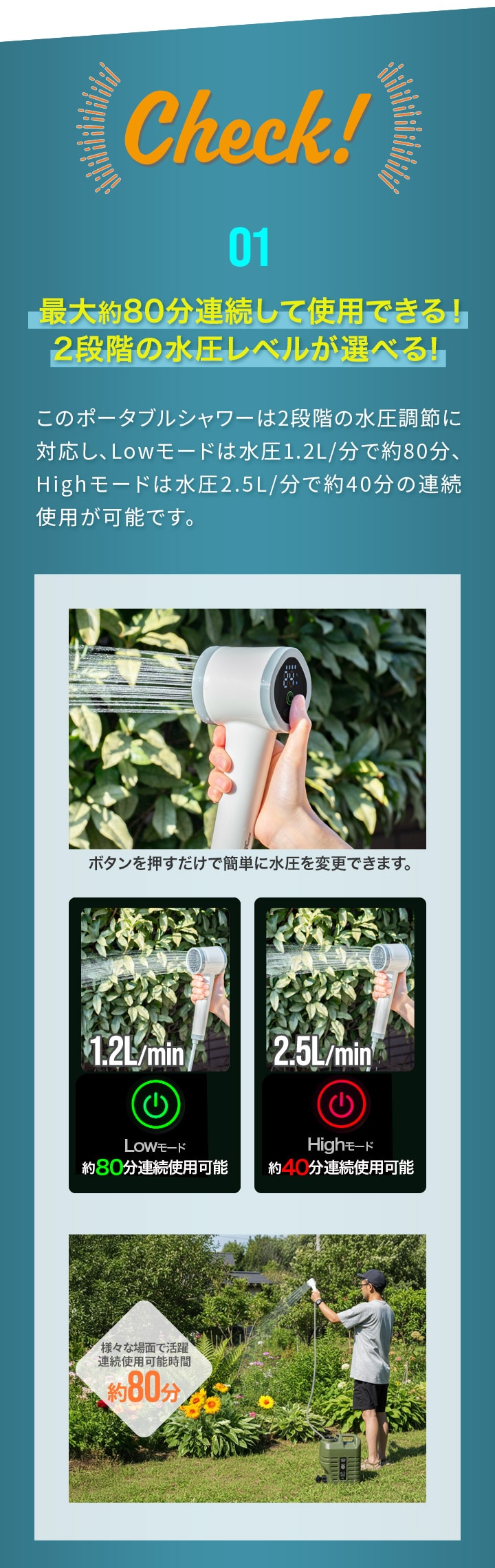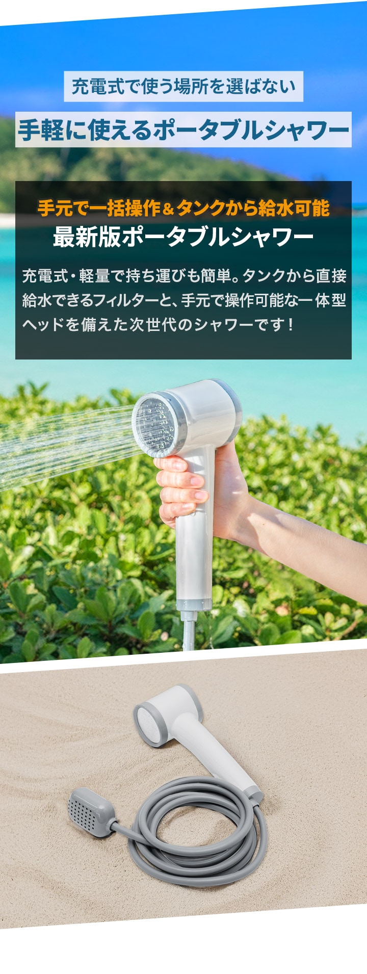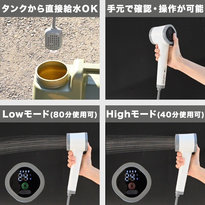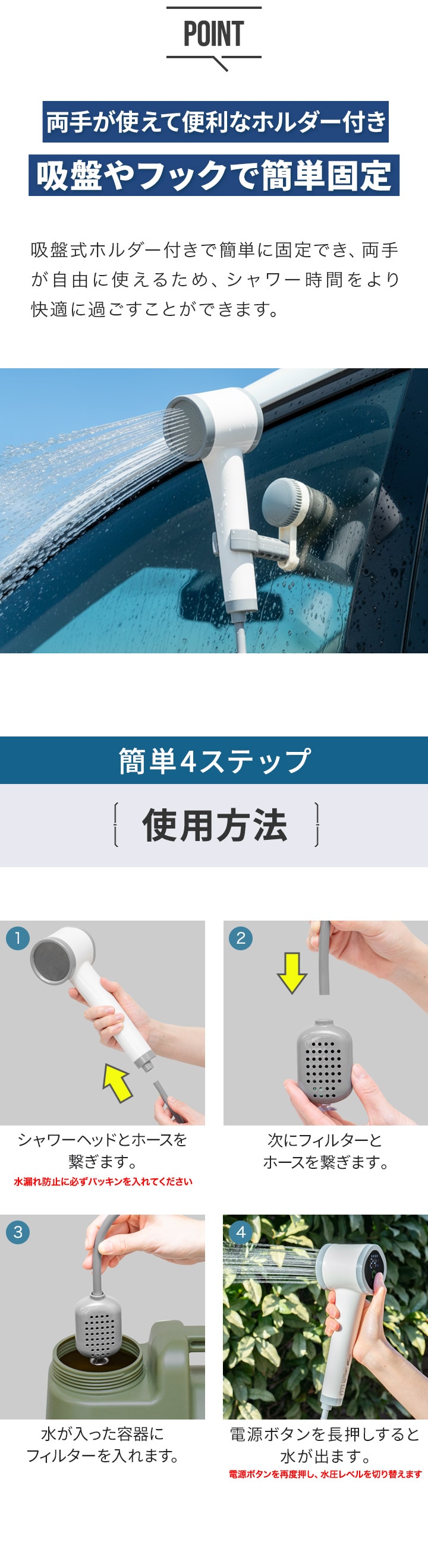 | 付属品: シャワーヘッド、ホース、フィルター、固定ホルダー、吸盤、収納ポーチ、USB Type-C充電ケーブル |
