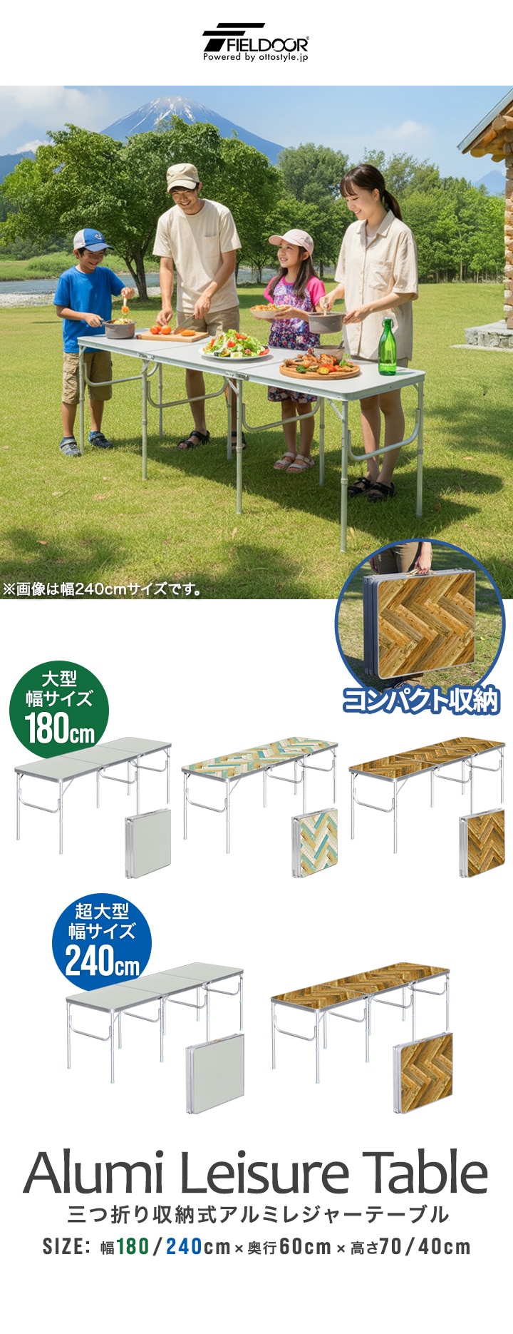 【SALE!7260円⇒6930円4/11正午まで】FIELDOOR アウトドアテーブル 折りたたみ 三つ折り (シルバー/幅180cm×奥行60cm) アルミ レジャーテーブル 長机 ワイド 大型 6人?8人 対応 高さ調整 2段階 キャンプ バーベキュー BBQ 送料無料
