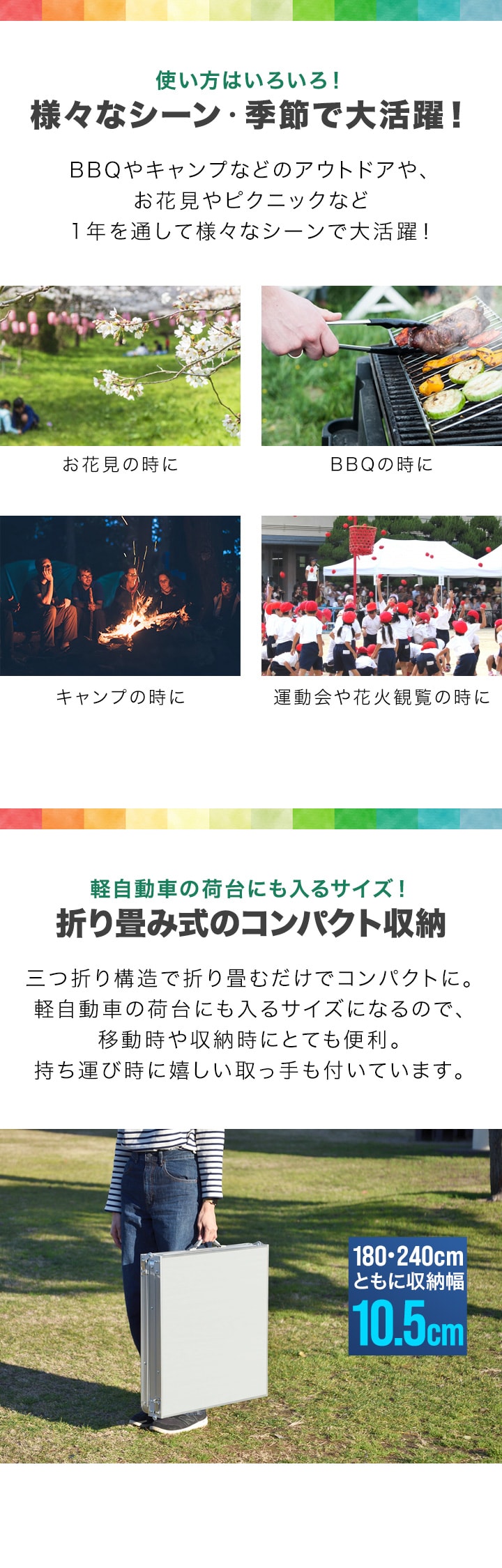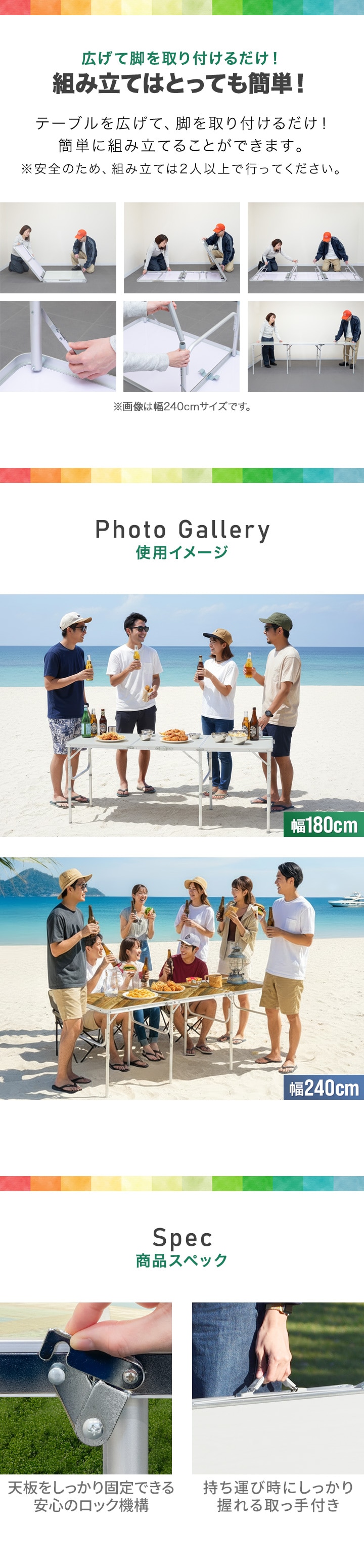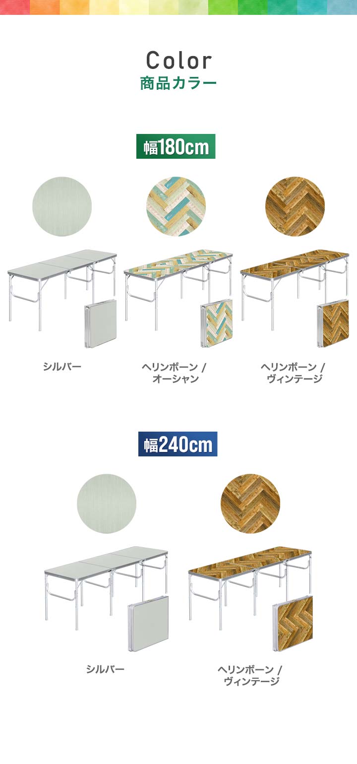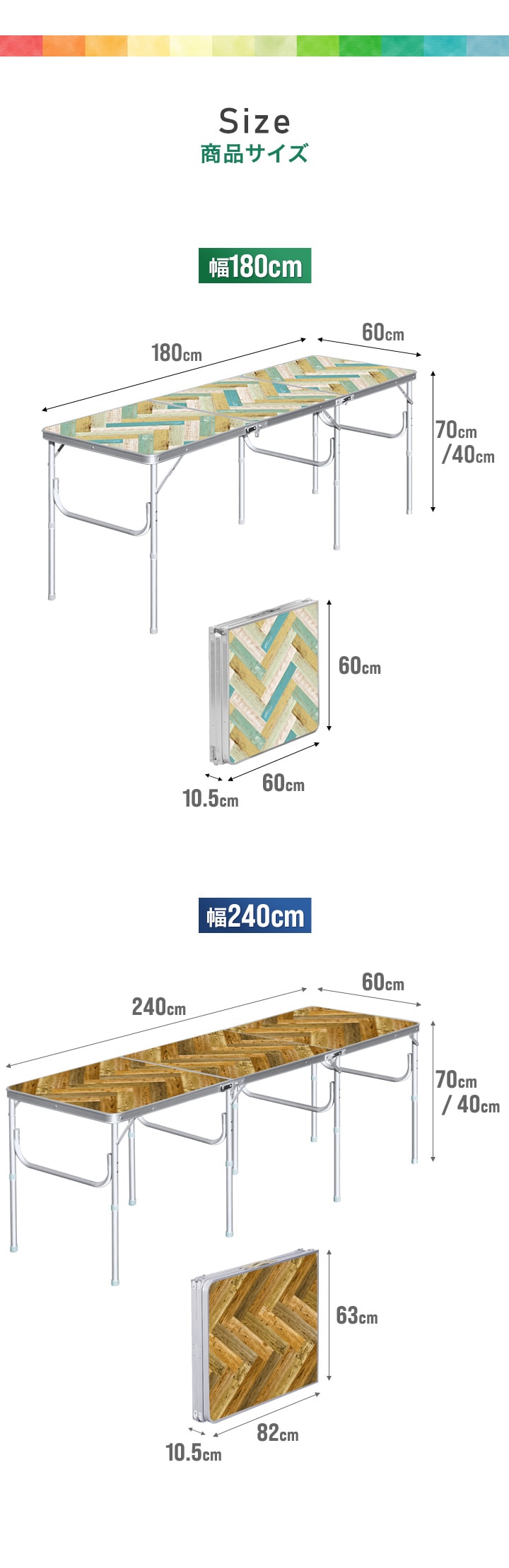 | サイズ: 【幅180cm】 テーブル : (約)幅180cm×奥行60cm×高さ70cm / 40cm 折りたたみ時 : (約)幅60cm×奥行60cm×高さ10.5cm 【幅240cm】 テーブル : (約)幅240cm×奥行60cm×高さ70cm / 40cm 折りたたみ時 : (約)幅82cm×奥行63cm×高さ10.5cm |