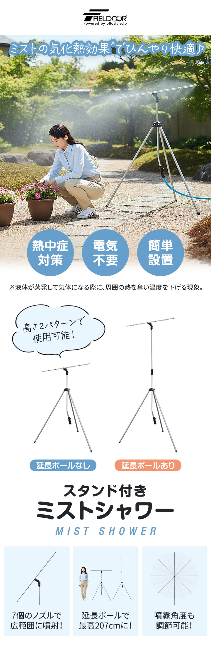 FIELDOOR ミストシャワー 散水シャワーキット 自立式 延長ポール・スタンド付き ドライミスト 熱中症対策 夏 暑さ対策 屋外 冷却 ミストノズル 散水 ベランダ 庭 ミスト 涼しい 家庭用 水道 アウトドア BBQ 水遊び 簡単 自作 DIY 送料無料