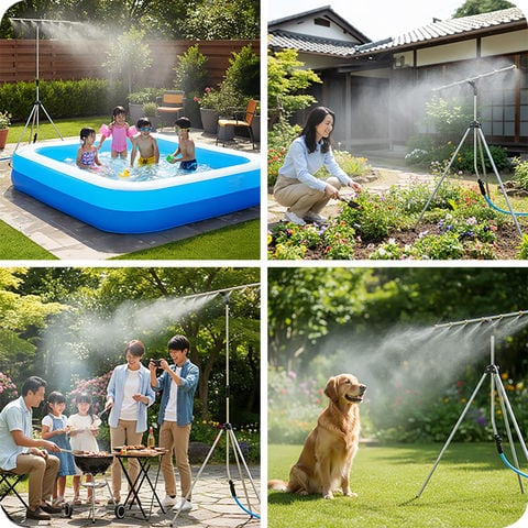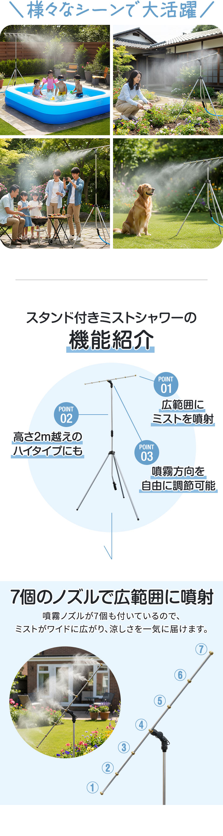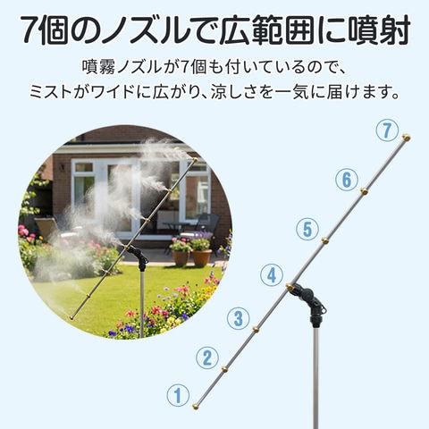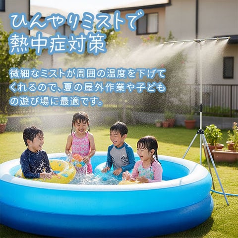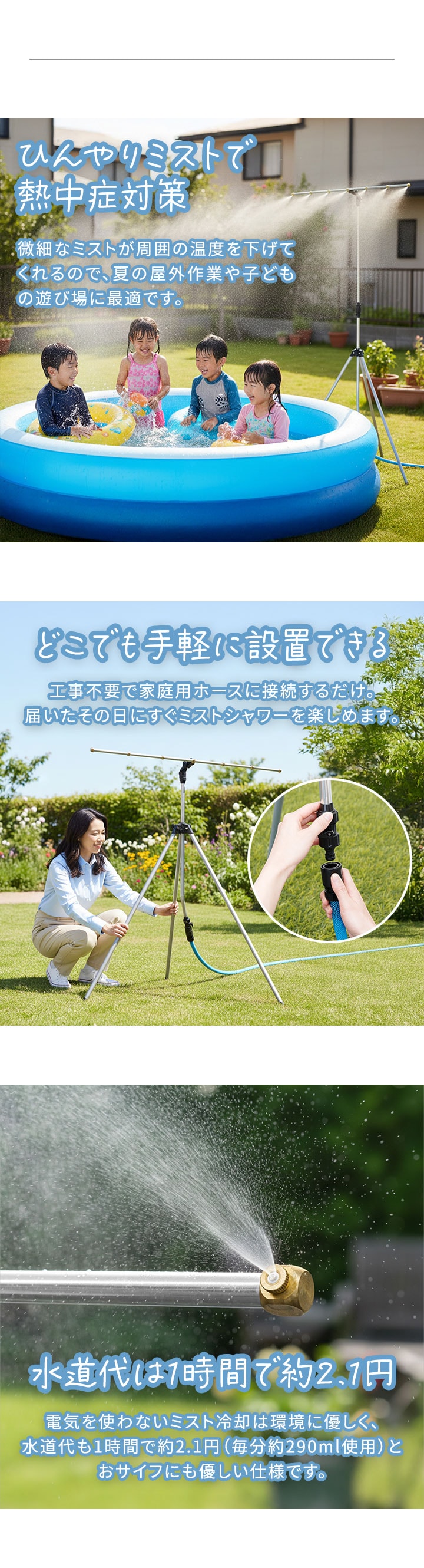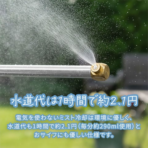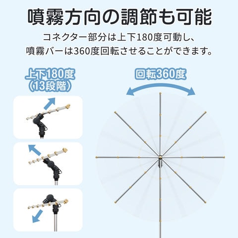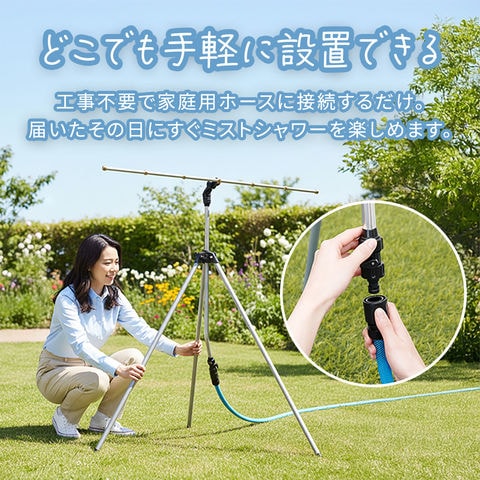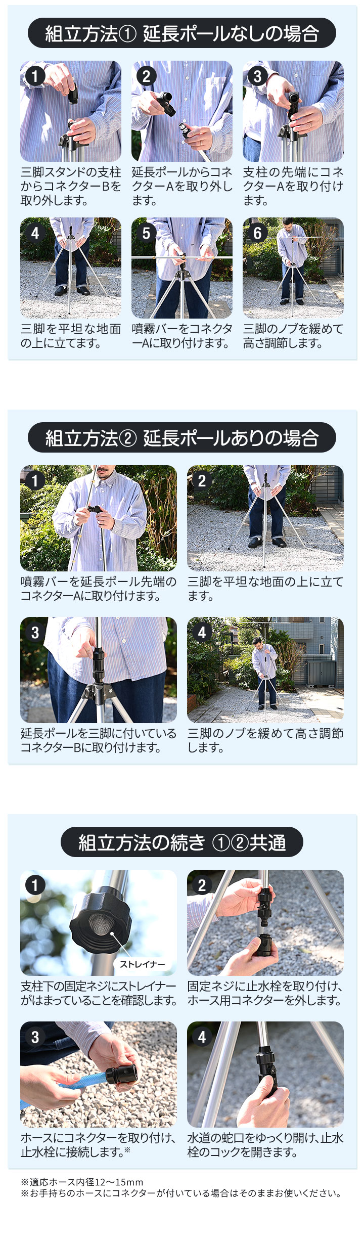 | 特記事項: ※本製品は家庭用の上水道専用です。井戸水、海水、雨水などを使用すると故障の原因となります。 ※水道を全開にすると破損する場合があります。また、水圧が低すぎるとミストが出ない場合があります。 ※お手持ちのホースにホース用コネクター(アタッチメント)が付いていない場合は、付属のホース用コネクターを取り付けて使用してください。(適応ホース内径12~15mm) ※ホースは付属しておりません。 ※風の強い日は、三脚スタンドに重し(目安は2Lペットボトル2本まで)を吊るしたり、重心を下げることで本体を安定させて転倒を防止することができます。 ※収納時は、しっかりと水を抜き、十分乾燥させてから収納してください。 |