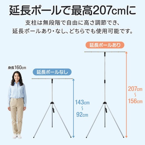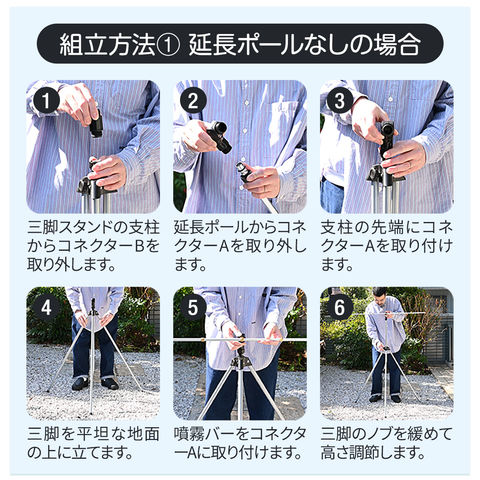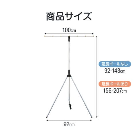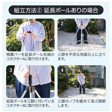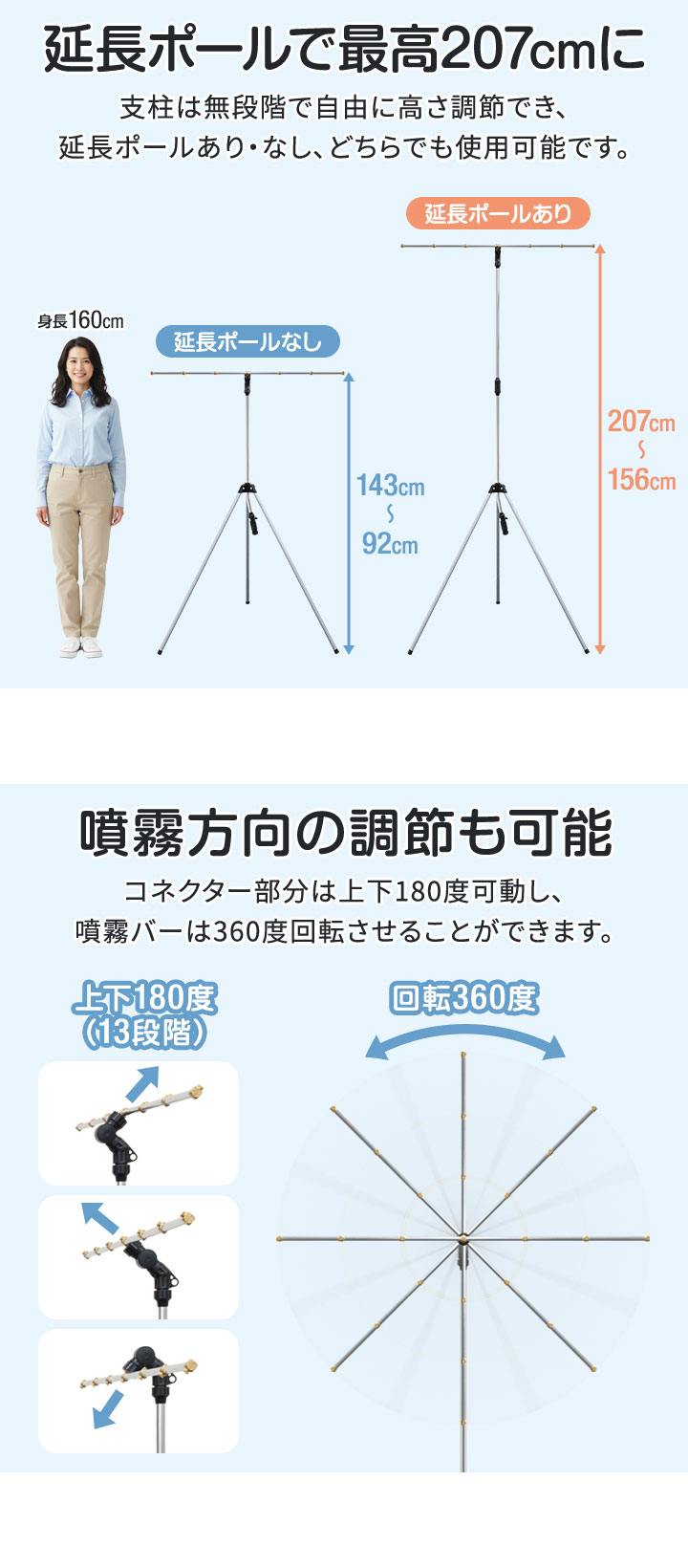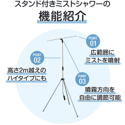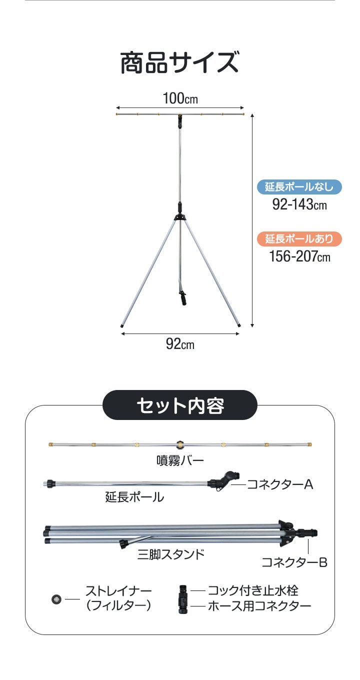 | サイズ: 噴霧バー : (約)幅100cm 延長ポールなしの高さ : (約)92cm~143cm 延長ポールありの高さ : (約)156cm~207cm 三脚間隔 : (約)92cm |