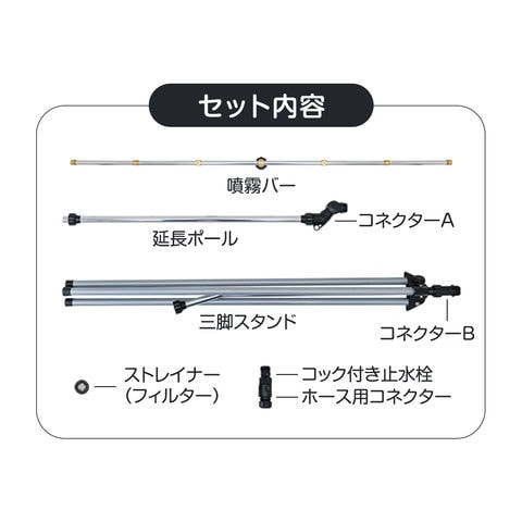 | セット内容: 噴霧バー×1、延長ポール+コネクターA×1、三脚スタンド+コネクターB×1、コック付き止水栓/ホース用コネクター×1、ストレイナー(フィルター)×1 ※コネクターAは延長ポールに取り付け済みで同梱されています。 ※コネクターBは三脚スタンドに取り付け済みで同梱されています。 ※コック付き止水栓とホース用コネクターはジョイントされた状態で同梱されています。 ※ストレイナー(フィルター)は支柱下の固定ネジにセットされています。 |