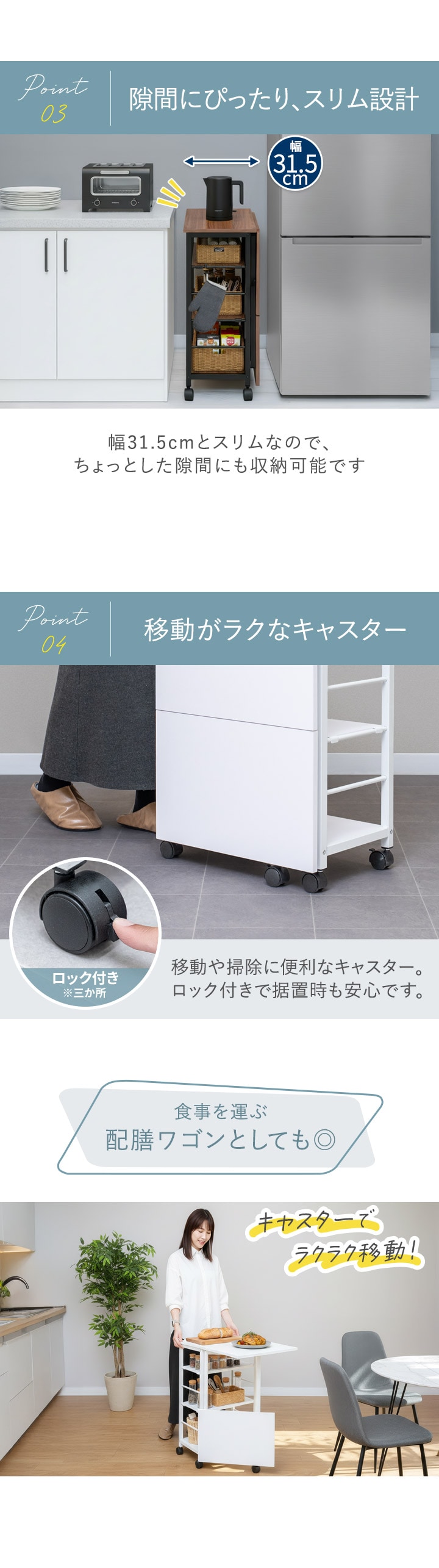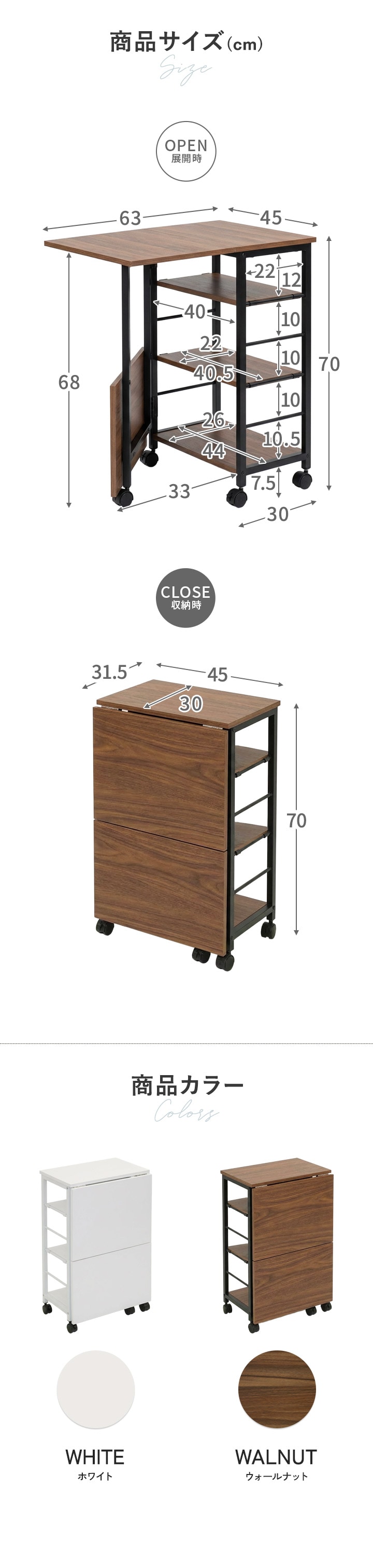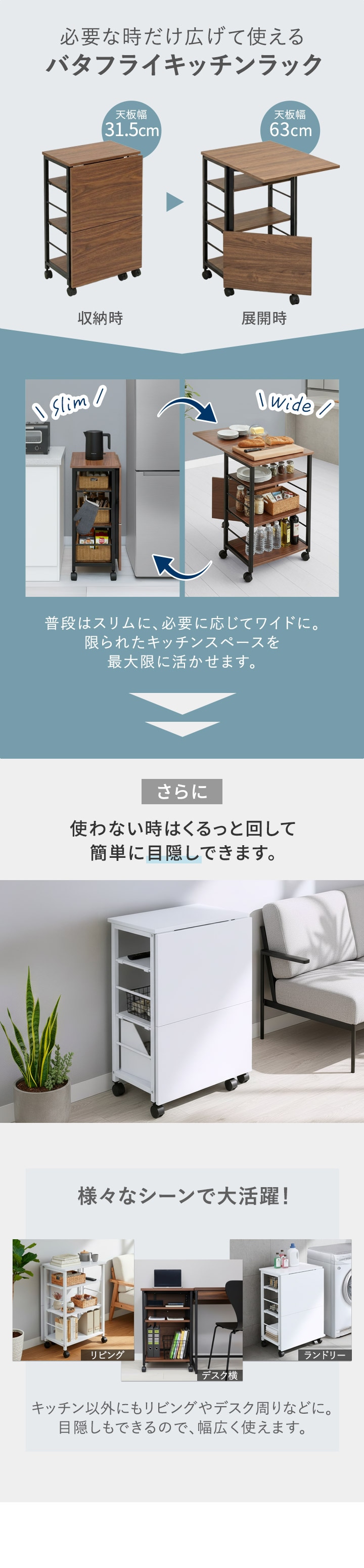キッチンワゴン キャスター付き (ホワイト) 折りたたみ バタフライ テーブル スリム 幅31.5cm 作業台 調理台 天板付き キッチン収納 キッチンラック 可動棚 隙間収納 目隠し 高さ70cm デスクワゴン 机 サイドワゴン 北欧 シンプル おしゃれ 1台2役 送料無料