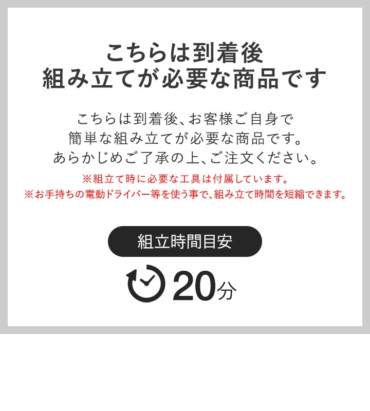 | 特記事項: ※こちらの商品はお客様組み立て品となります。(工具は付属しています) ※安全のため、組み立ては2人以上で行ってください。 ※耐荷重を超えてものを載せないでください。 ※組み立ての際は、電動ドライバーの使用を推奨します。お手持ちの電動ドライバーを使うことで、組み立て時間を短縮することができます。 |