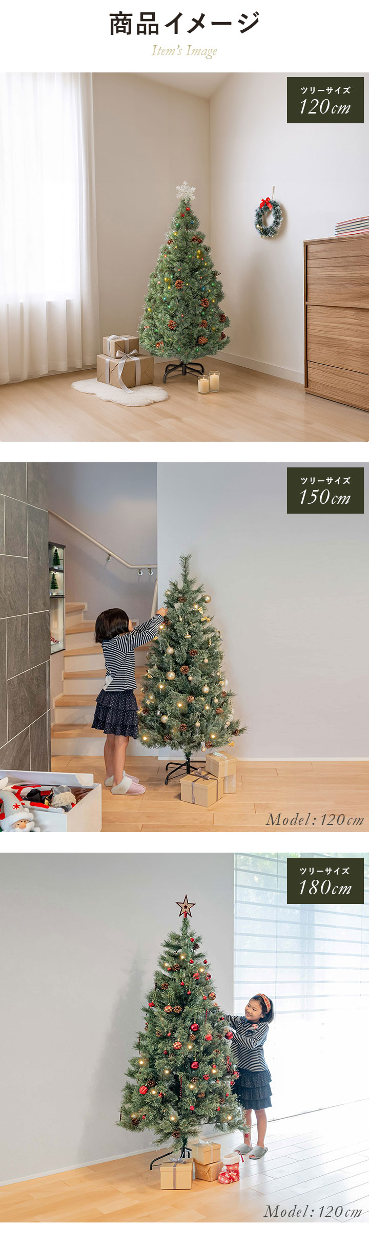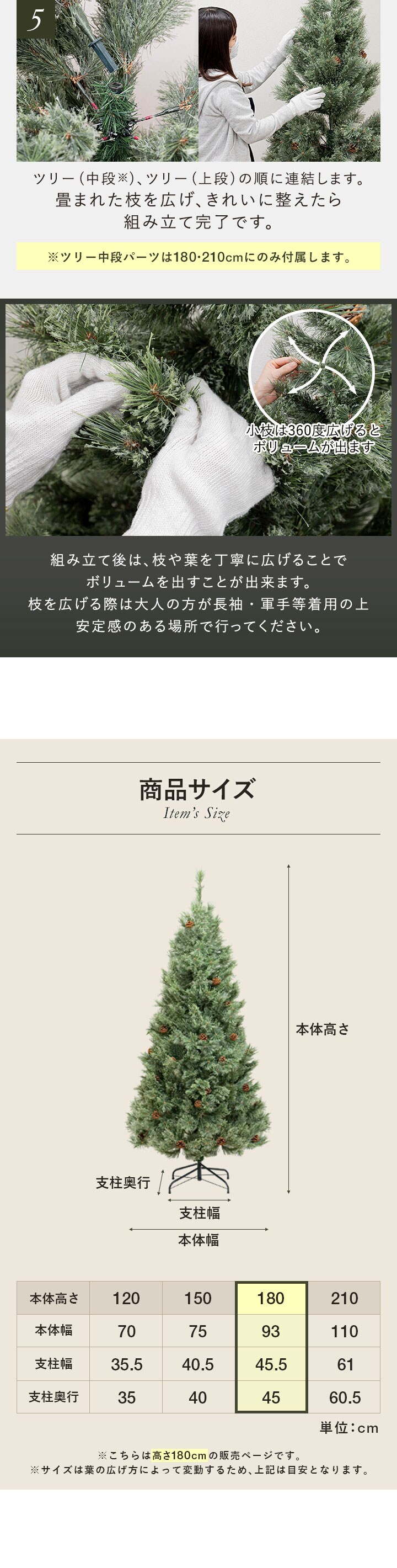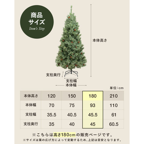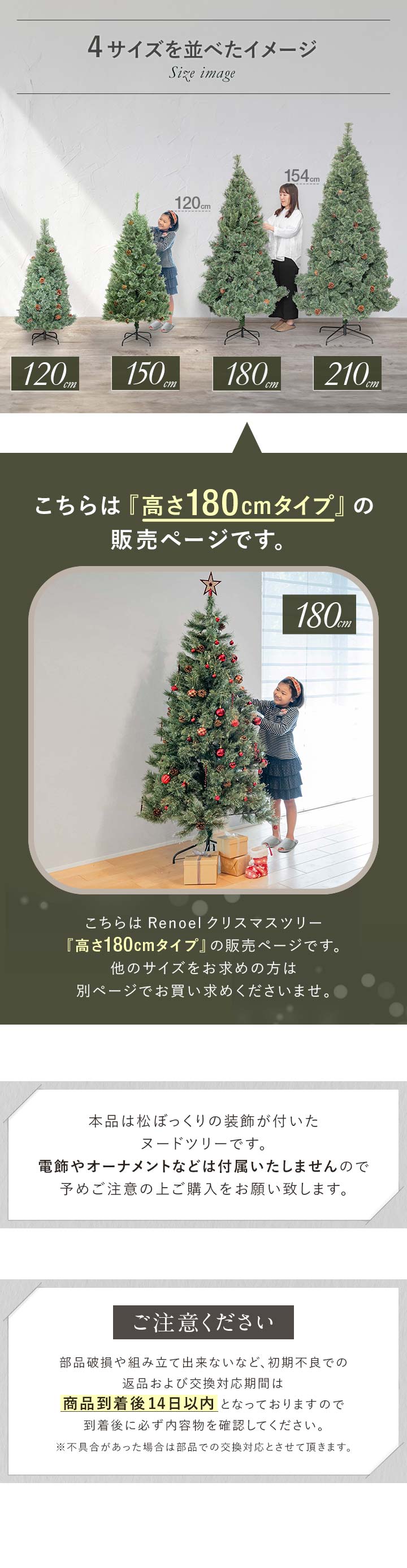 | 特記事項: こちらは高さ180cmタイプの販売ページです。 ※本品は松ぼっくりの装飾が付いたヌードツリーです。電飾やオーナメントなどは付属いたしませんので、予めご注意の上ご購入をお願い致します。 ※葉は針葉のため、枝を広げる際は大人の方が長袖・軍手等着用の上、安定感のある場所で行ってください。 |