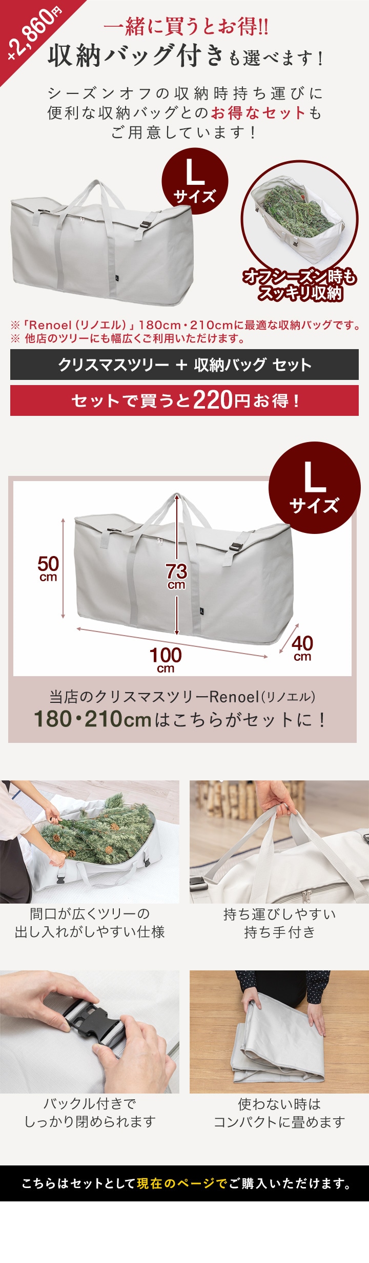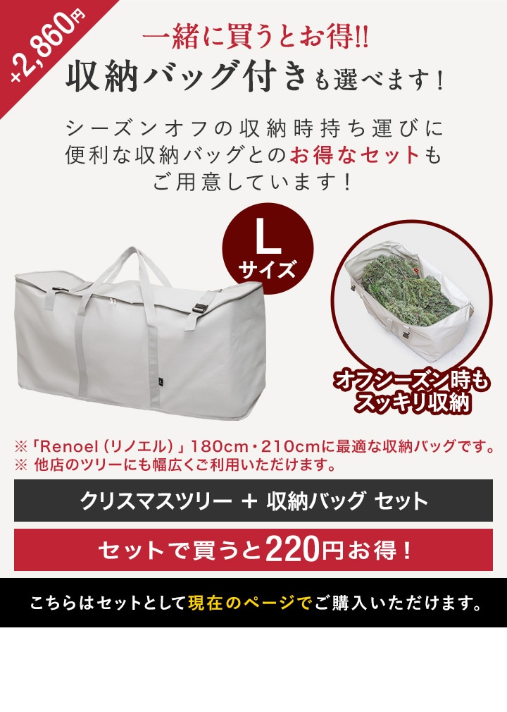 | 特記事項: ※こちらはLサイズの販売ページです。 ※当店以外のクリスマスツリーを収納する事もできますが、ご購入前にお持ちのツリーをお客様自身で計測の上、ご購入ください。 ※クリスマスツリー用の収納バッグとなりますので、オーナメントなどの飾り等は別でご収納ください。 ※クリスマスツリーを収納する際は、広がった枝葉をできるだけコンパクトにまとめた上で収納してください。 ※押し込むような収納は、変形や破損の原因になる可能性があるのでご注意ください。 |