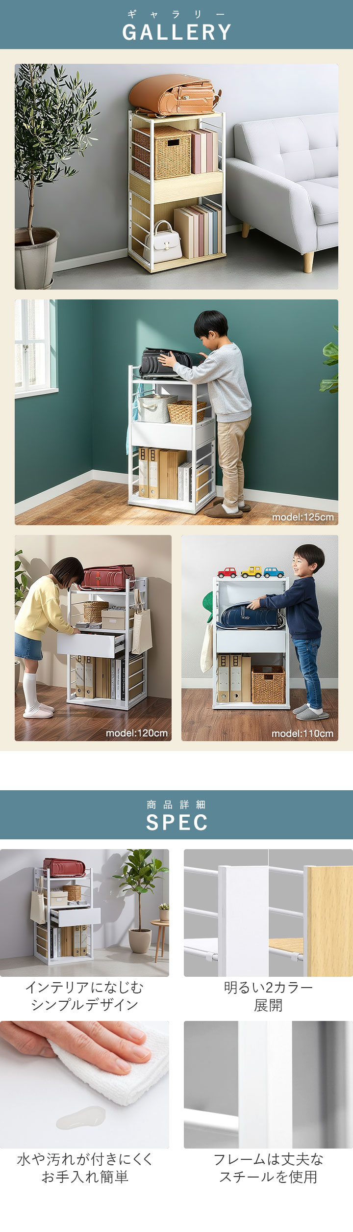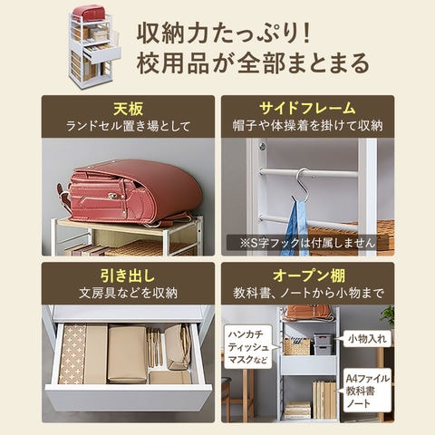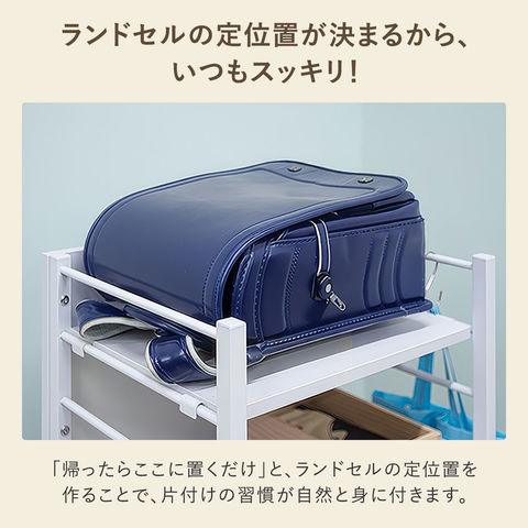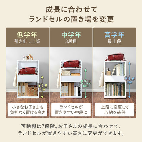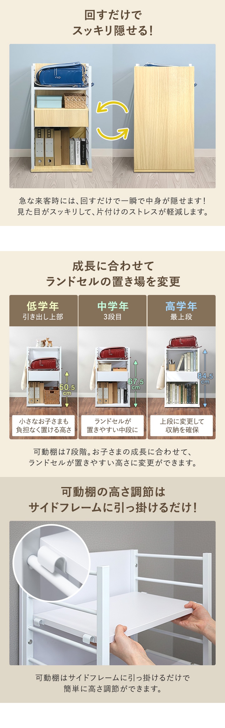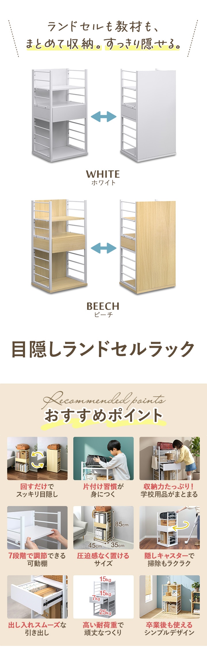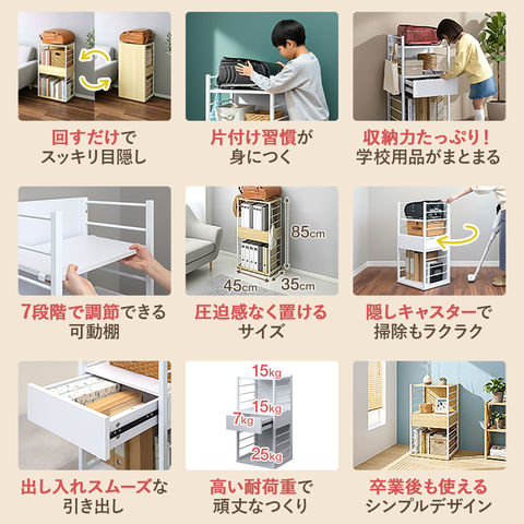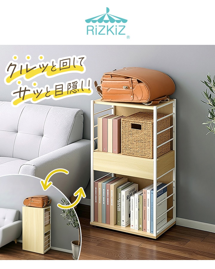 RiZKiZ ランドセルラック キャスター付き (ホワイト) 目隠しワゴン 幅45cm×高さ85cm ランドセル収納 スリム 可動棚 引出し付き お片付け 本棚 子供部屋 入学準備 インテリア 収納 ラック 子供用 収納棚 教科書 おもちゃ 小学校 おしゃれ 木目 北欧 送料無料