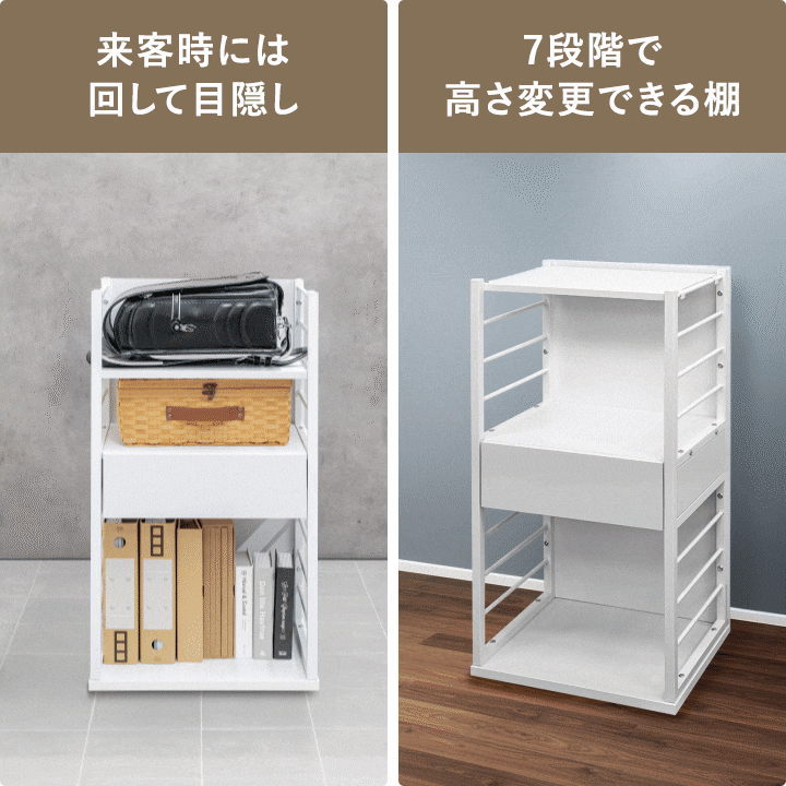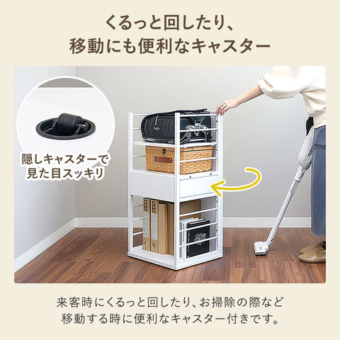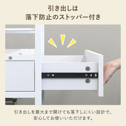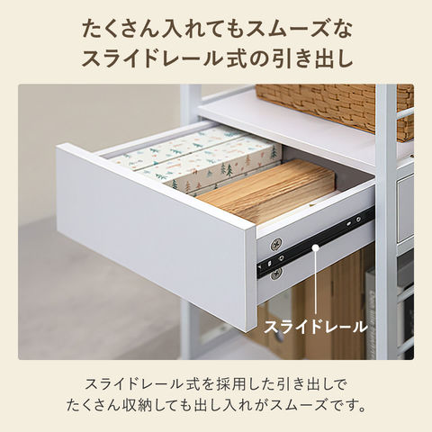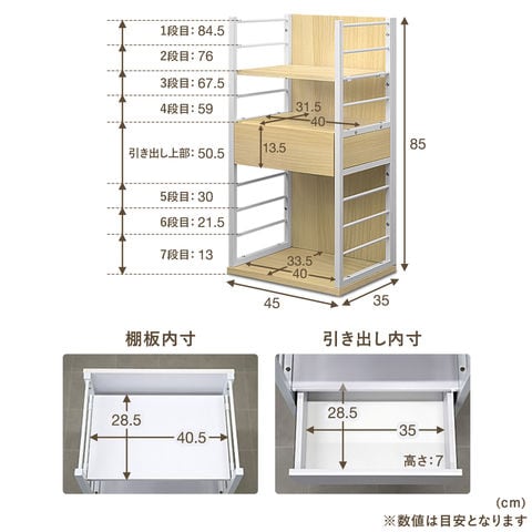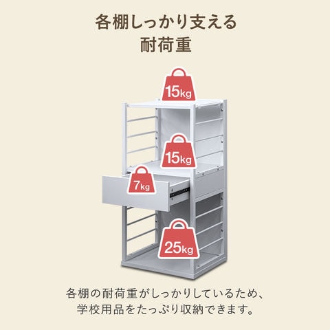 | 耐荷重: 可動棚:15kg 引き出し上部:15kg 引き出し内部:7kg 最下段:25kg |
