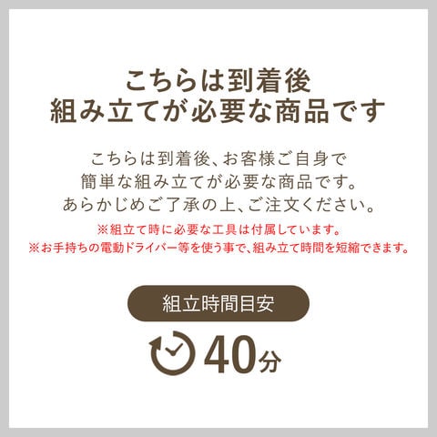 | 特記事項: ※こちらの商品はお客様組み立て品となります。(工具は付属しています) ※安全のため、組み立ては2人以上で行ってください。 ※耐荷重を超えてものを載せないでください。 ※組み立ての際は、電動ドライバーの使用を推奨します。お手持ちの電動ドライバーを使うことで、組み立て時間を短縮することができます。 |