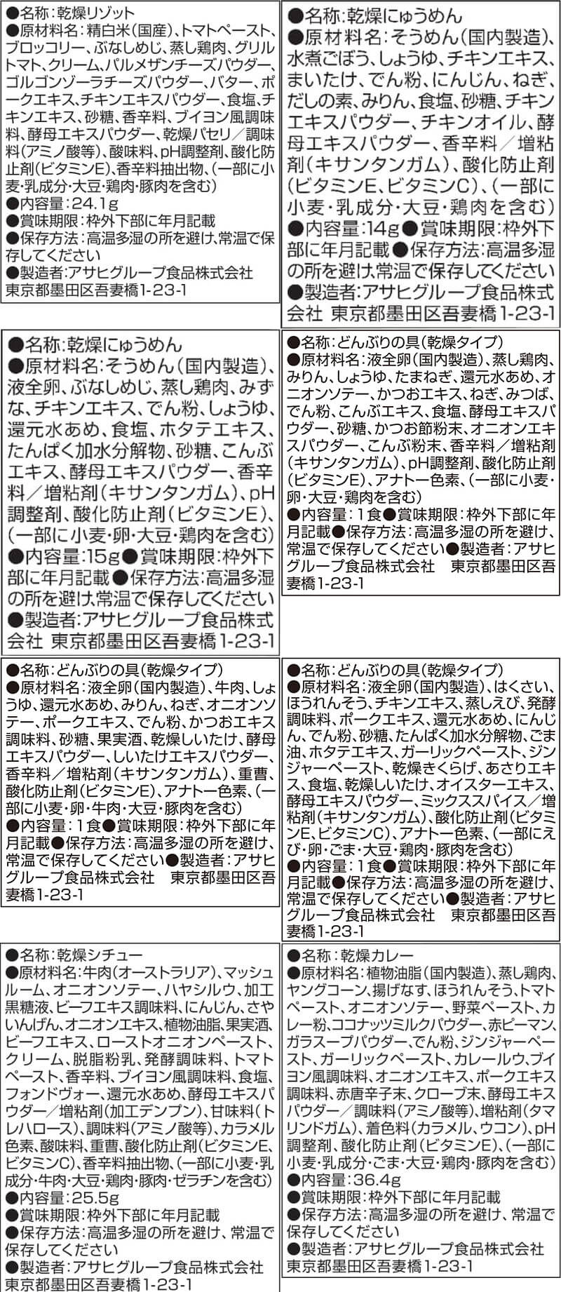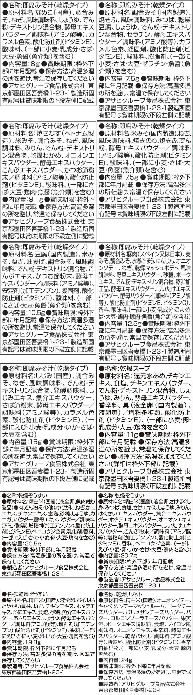 ■ いつものおみそ汁 なす 9.5g あさり 7.4g あおさ 8.2g とうふ 10g ほうれん草 7g 小松菜 8.3g 長ねぎ 9g 白菜 9g 野菜 10g ごぼう 9g 里いも 9g とん汁 10.5g なめこ 赤だし 8g 赤だし 三つ葉入り 7.5g ■ いつものおみそ汁 贅沢 焼なす 9.1g 海苔 7.5g とうふ 10.5g 豚汁 12.5g しじみ 赤だし 15g ■ Theうまみ たまごスープ 11g ■ 雑炊 ほぐし身入り かに雑炊 20.5g ほぐし身入り さけ雑炊 20.7g まるごと 貝柱雑炊 19.8g ■ リゾット 濃厚3種のチーズリゾット 24g 完熟トマトのチーズリゾット 24.1g ■ にゅうめん とろみ醤油 14g まろやか鶏だし 15g ■ 丼の具 とろっと卵の親子丼の具 22.5g 甘とろ卵の牛とじ丼の具 23.8g 七種具材の中華丼の具 17g ■ シチュー 5種具材のビーフシチュー 25.5g ■ カレー 野菜と鶏肉のカレー 36.4g 32種 32食 |