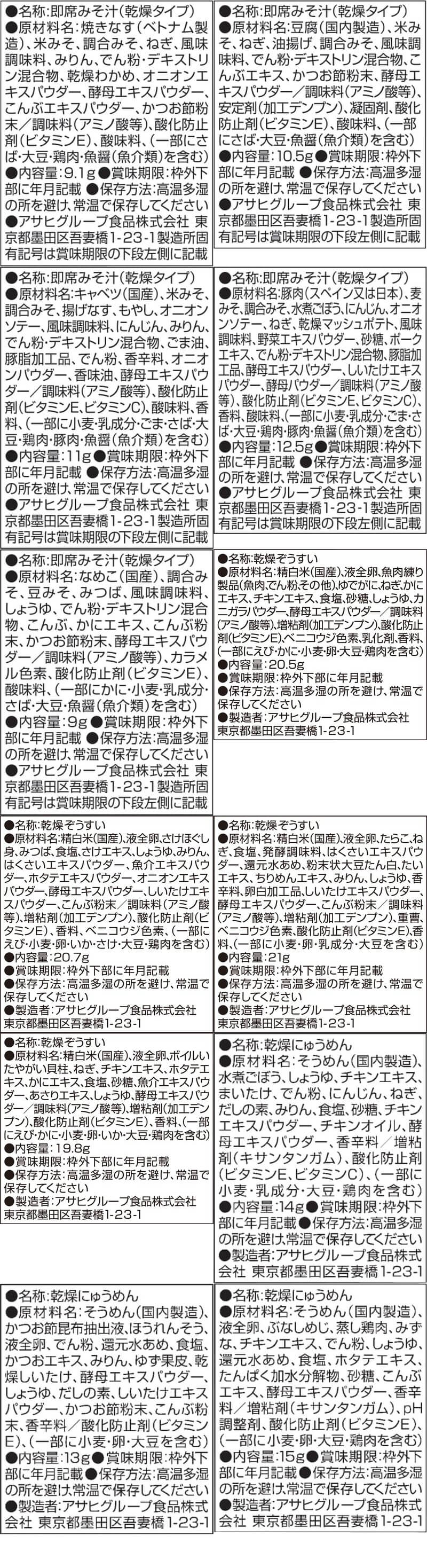 ■ いつものおみそ汁 贅沢 焼なす 9.1g とうふ 10.5g 炒め野菜 11g 豚汁 12.5g なめこ 9g ■ 雑炊 ほぐし身入り かに雑炊 20.5g ほぐし身入り さけ雑炊 20.7g 炙り たらこ雑炊 21g まるごと 貝柱雑炊 19.8g ■ にゅうめん とろみ醤油 14g すまし柚子 13g まろやか鶏だし 15g 五種の野菜 あっさりみそ味 18.5g ■ 丼の具 とろっと卵の親子丼の具 22.5g 甘とろ卵の牛とじ丼の具 23.8g 15種 15食 |