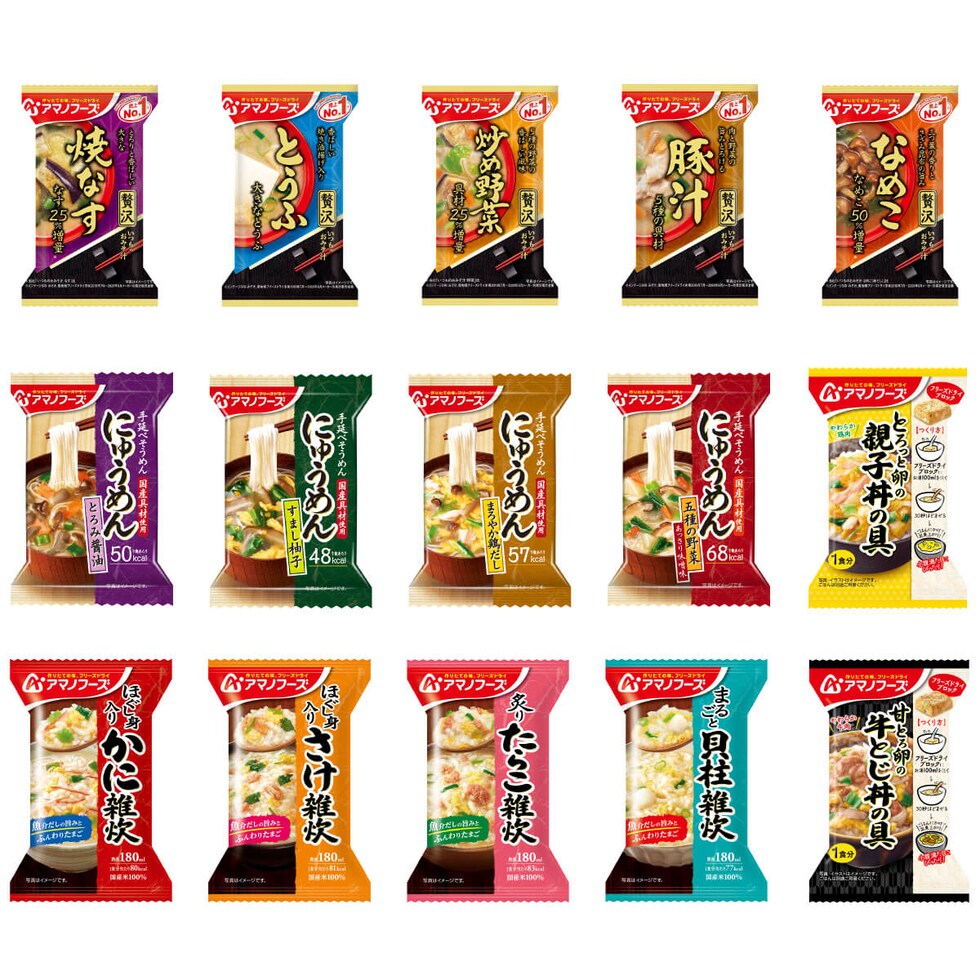 ■ いつものおみそ汁 贅沢 焼なす 9.1g とうふ 10.5g 炒め野菜 11g 豚汁 12.5g なめこ 9g ■ 雑炊 ほぐし身入り かに雑炊 20.5g ほぐし身入り さけ雑炊 20.7g 炙り たらこ雑炊 21g まるごと 貝柱雑炊 19.8g ■ にゅうめん とろみ醤油 14g すまし柚子 13g まろやか鶏だし 15g 五種の野菜 あっさりみそ味 18.5g ■ 丼の具 とろっと卵の親子丼の具 22.5g 甘とろ卵の牛とじ丼の具 23.8g 15種 各3食 合計45食 |