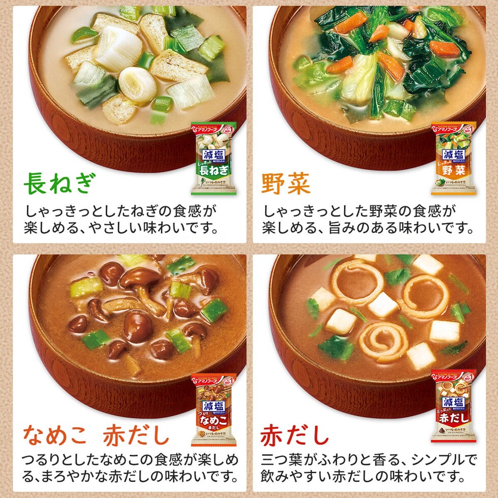 アマノフーズ フリーズドライ食品 減塩味噌汁 減塩いつものおみそ汁 8種 詰め合わせ セット インスタント味噌汁 は 塩分 25%カット 健康 をアシスト 毎日食べたくなる 減塩 いつものおみそ汁 人気 の なす なめこ 赤だし や 定番 の 豆腐 長ネギ 等 食べ比べ してお楽しみください。 フリーズドライ 食品 は、 味 香り 栄養 はそのままに お湯を注ぐだけ で いつでも 簡単 手軽 に 出来立ての 美味しさ が頂けます。 減塩 で 塩分 控えめ 健康 をアシスト!