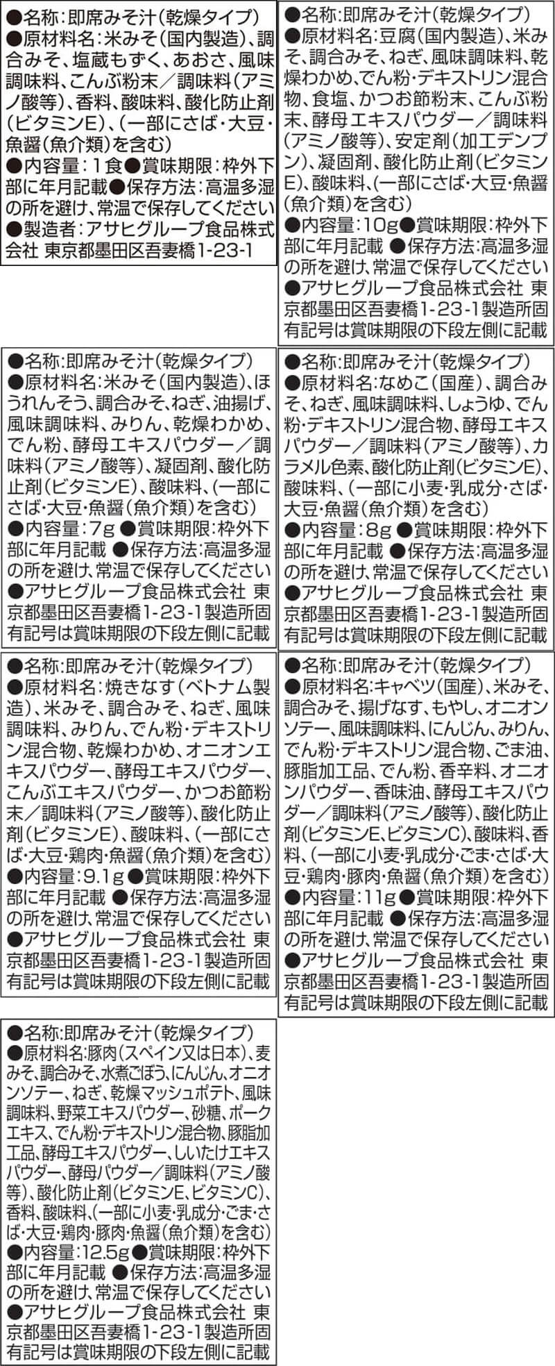 ■ いつものおみそ汁 あおさ 8.2g とうふ 10g ほうれん草 7g なめこ 赤だし 8g ■ いつものおみそ汁 贅沢 焼なす 9.1g 炒め野菜 11g 豚汁 12.5g 7種 7食 |