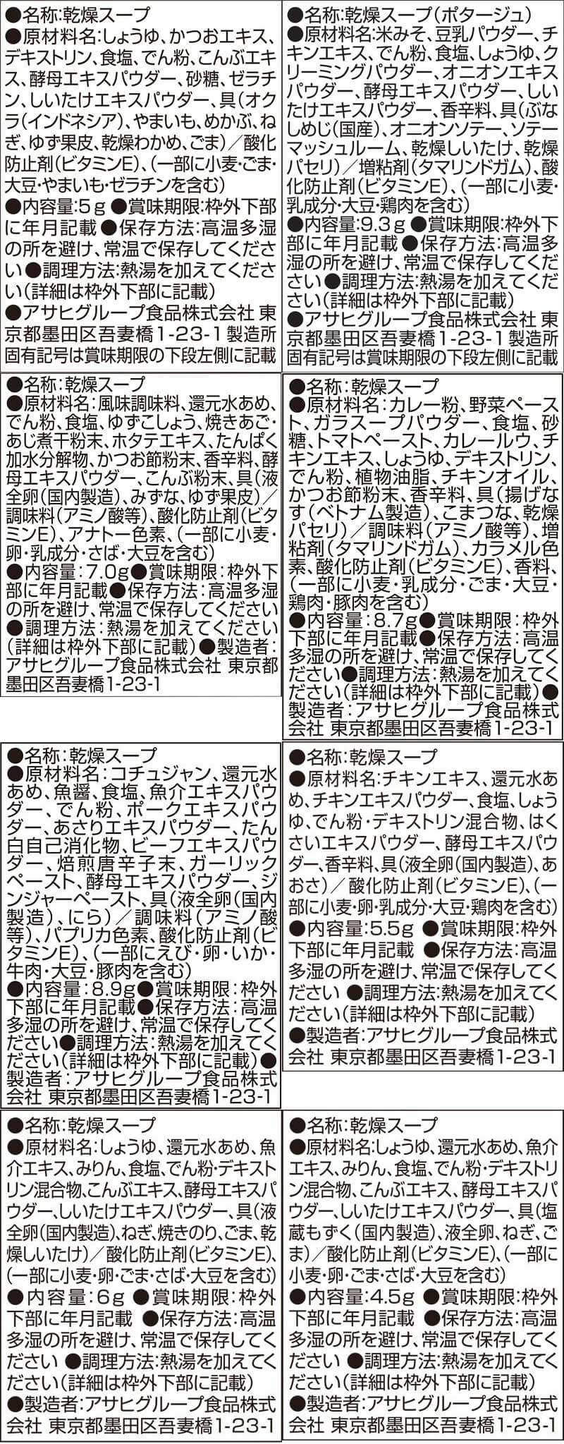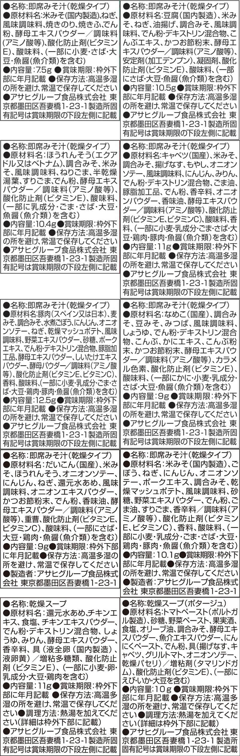 ■ いつものおみそ汁 野菜 10g ■ いつものおみそ汁 贅沢 しじみ 赤だし 15g ■ 旨だし おみそ汁 なす汁 合わせ 9g こまつ菜 合わせ 9g 豚汁 12.5g なめこ 合わせ 8g ■ Theうまみ 粒コーンとポテトのポタージュ 19.8g |