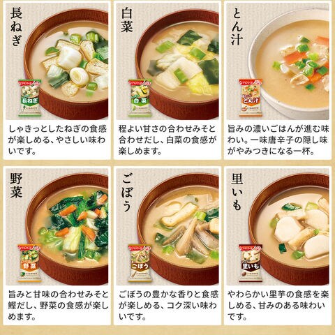 ■ いつものおみそ汁 なす 9.5g あさり 7.4g あおさ 8.2g とうふ 10g ほうれん草 7g 小松菜 8.3g 長ねぎ 9g 白菜 9g 野菜 10g ごぼう 9g 里いも 9g とん汁 10.5g なめこ 赤だし 8g 赤だし 三つ葉入り 7.5g 香りうめ 6.2g 香りゆず 9.3g 香り山椒 9g ■ いつものおみそ汁 贅沢 焼なす 9.1g 海苔 7.5g とうふ 10.5g ほうれん草と湯葉 10.4g 焼ねぎ 8.7g 炒め野菜 11g 豚汁 12.5g なめこ 9g だし煮大根 9g ■ 旨だし おみそ汁 なす汁 合わせ 9g こまつ菜 合わせ 9g 豚汁 12.5g なめこ 合わせ 8g なめこ 赤だし 8g 31種 各2食 合計62食 |