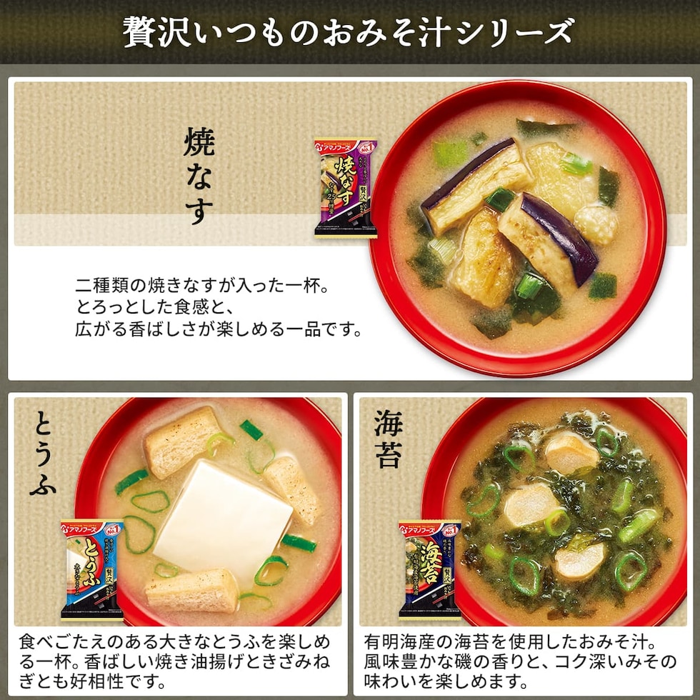 毎日食べたくなる いつものおみそ汁 味噌汁の具 にこだわり抜いた 贅沢 いつものおみそ汁 風味豊かで やさしい味わい 旨だし シリーズのおみそ汁 計3シリーズ いろんな種類の お味噌汁 を 食べ比べ してお楽しみください。