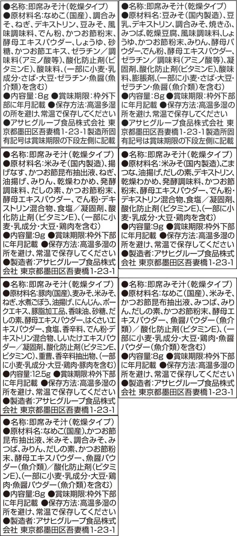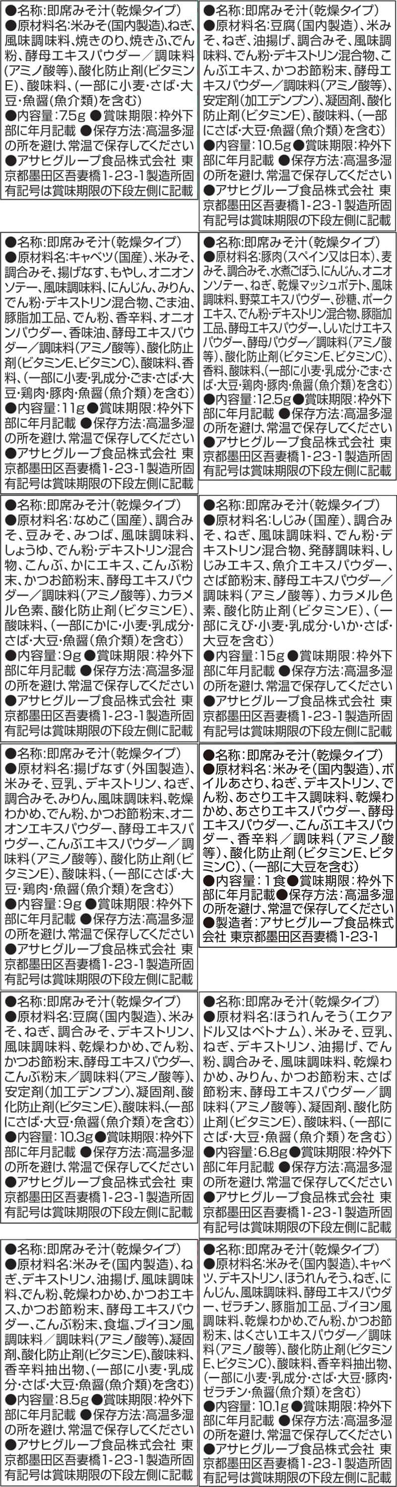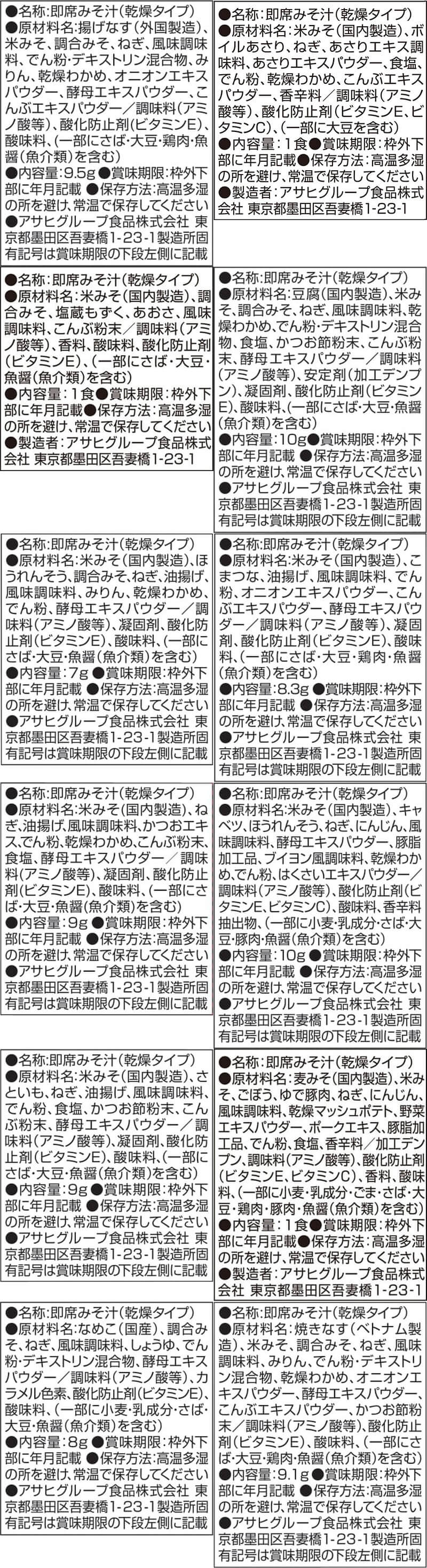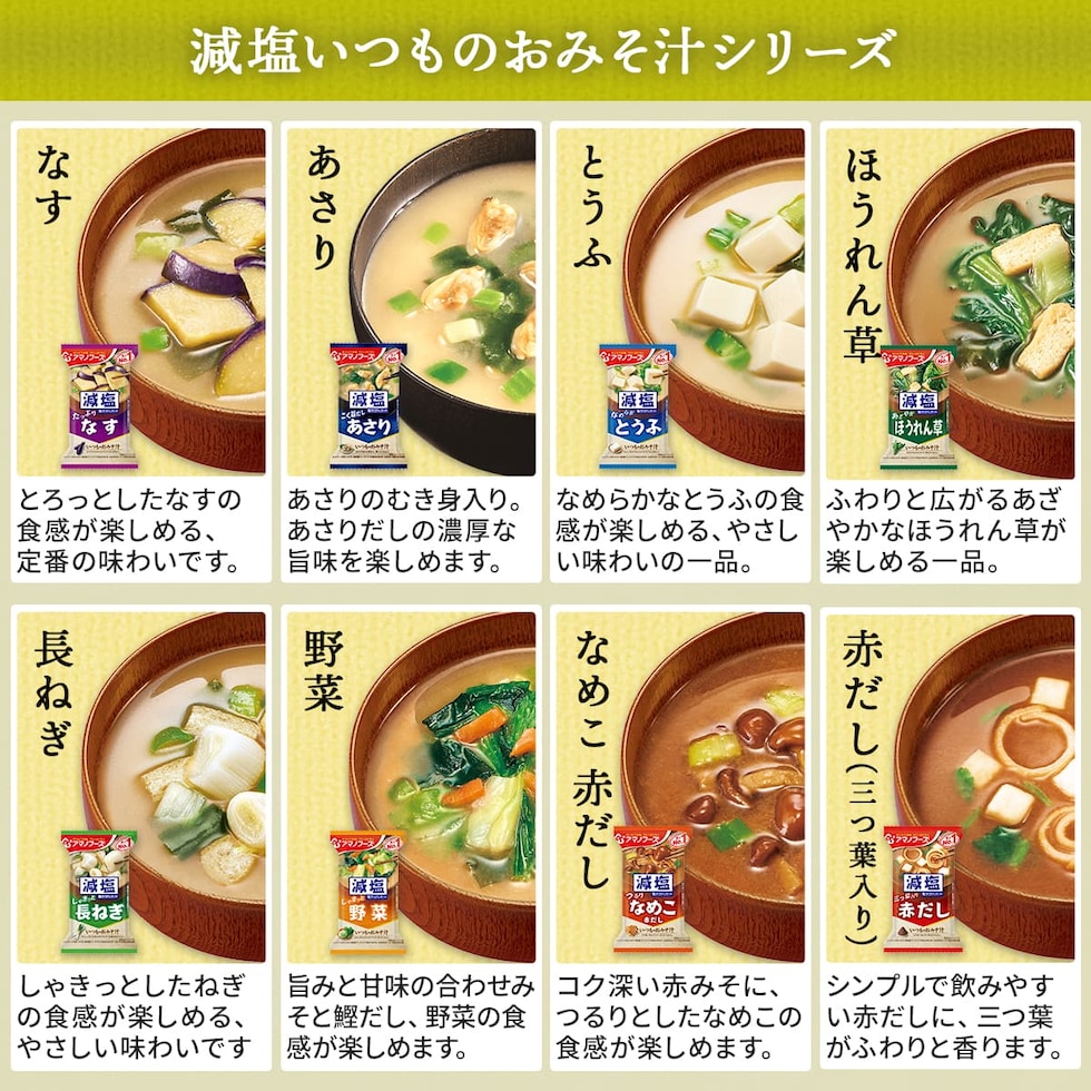 ■ いつものおみそ汁 なす 9.5g あさり 7.4g あおさ 8.2g とうふ 10g ほうれん草 7g 小松菜 8.3g 長ねぎ 9g 野菜 10g 里いも 9g とん汁 10.5g なめこ 赤だし 8g ■ いつものおみそ汁 贅沢 焼なす 9.1g 海苔 7.5g とうふ 10.5g 炒め野菜 11g 豚汁 12.5g なめこ 9g しじみ 赤だし 15g ■ 減塩 いつものおみそ汁 減塩なす 9g 減塩あさり 7.5g 減塩とうふ 10.3g 減塩ほうれん草 6.8g 減塩長ねぎ 8.5g 減塩野菜 10.1g 減塩なめこ 赤だし 8g 減塩赤だし 三つ葉入り 8g ■ 旨だし おみそ汁 なす汁 合わせ 9g こまつ菜 合わせ 9g 豚汁 12.5g なめこ 合わせ 8g なめこ 赤だし 8g 31種 31食 |