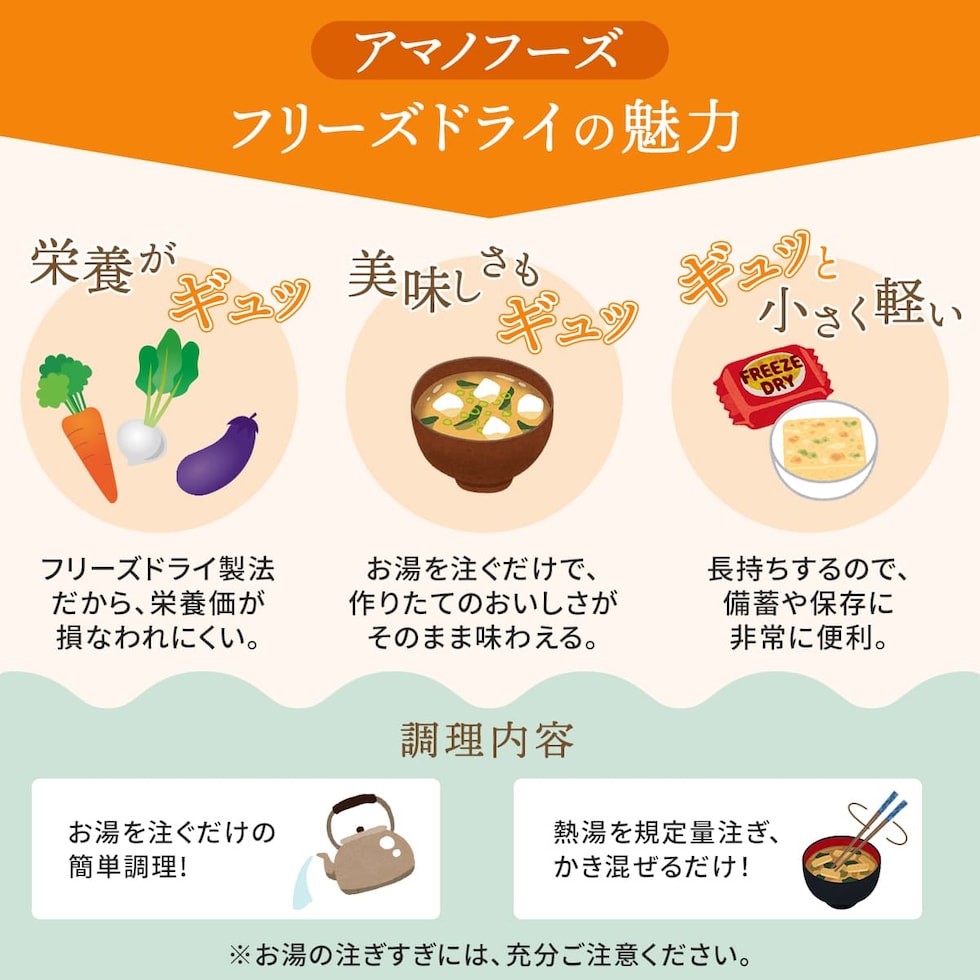 アマノフーズ フリーズドライ食品 インスタント 味噌汁 31種 詰め合わせ セット 毎日食べたくなる いつものおみそ汁 味噌汁の具 にこだわり抜いた 贅沢 いつものおみそ汁 通常商品より 塩分 25%カット 健康 をアシストする 減塩 いつもの おみそ汁 旨だし の計4シリーズ いろんな種類の お味噌汁 を 食べ比べ してお楽しみください。 フリーズドライ 食品 は、 味 香り 栄養 はそのままに お湯を注ぐだけ で いつでも 簡単 手軽 に 出来立ての 美味しさ が頂けます。