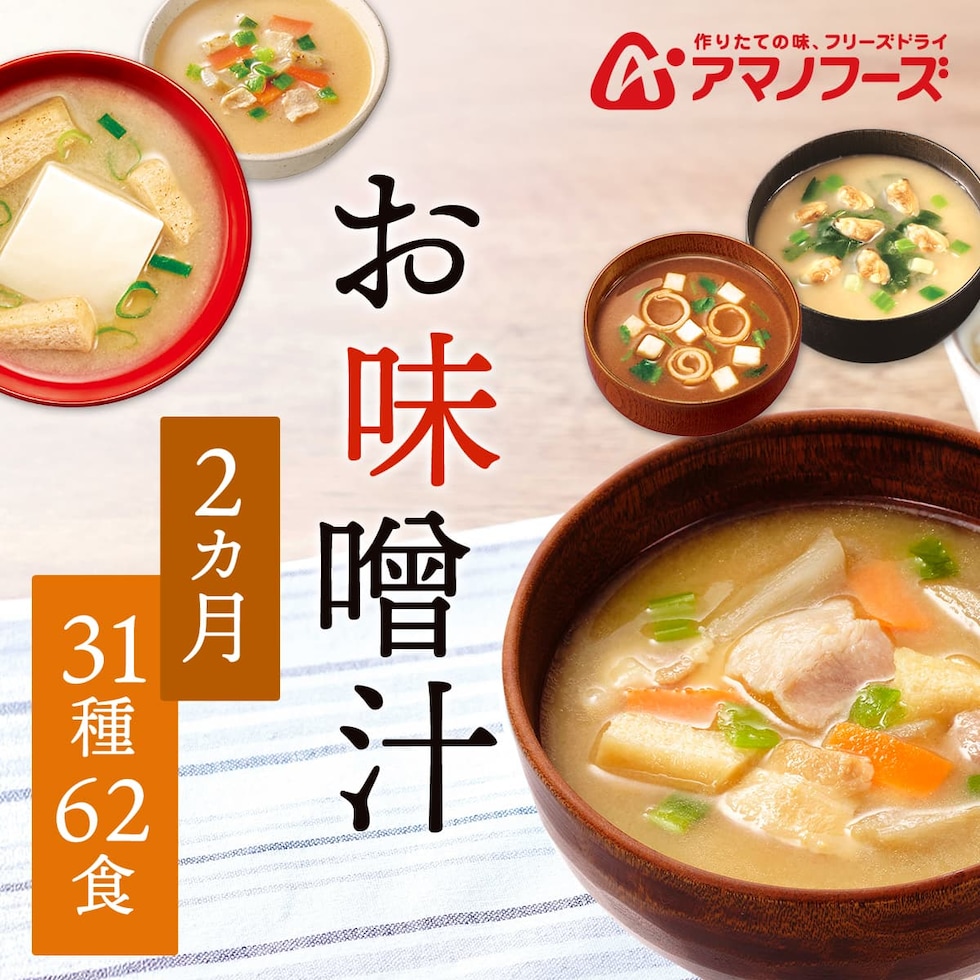 アマノフーズ フリーズドライ 減塩 入り 味噌汁 2ヶ月 31種62食 詰め合わせ セット 【 送料無料 】 即席みそ汁 インスタント食品 常温保存 減塩味噌汁 おみそ汁 お味噌汁 みそ汁 味噌汁 仕送り 備蓄 防災 非常食 ホワイトデー 2026 新生活 ギフト