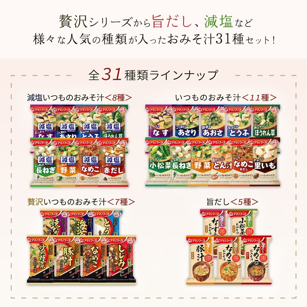 アマノフーズ フリーズドライ食品 インスタント 味噌汁 31種 詰め合わせ セット 毎日食べたくなる いつものおみそ汁 味噌汁の具 にこだわり抜いた 贅沢 いつものおみそ汁 通常商品より 塩分 25%カット 健康 をアシストする 減塩 いつもの おみそ汁 旨だし の計4シリーズ いろんな種類の お味噌汁 を 食べ比べ してお楽しみください。 フリーズドライ 食品 は、 味 香り 栄養 はそのままに お湯を注ぐだけ で いつでも 簡単 手軽 に 出来立ての 美味しさ が頂けます。
