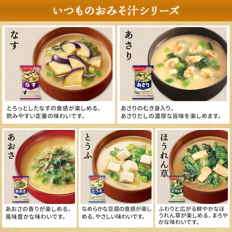 ■ いつものおみそ汁 なす 9.5g あさり 7.4g あおさ 8.2g とうふ 10g ほうれん草 7g 小松菜 8.3g 長ねぎ 9g 野菜 10g 里いも 9g とん汁 10.5g なめこ 赤だし 8g ■ いつものおみそ汁 贅沢 焼なす 9.1g 海苔 7.5g とうふ 10.5g 炒め野菜 11g 豚汁 12.5g なめこ 9g しじみ 赤だし 15g ■ 減塩 いつものおみそ汁 減塩なす 9g 減塩あさり 7.5g 減塩とうふ 10.3g 減塩ほうれん草 6.8g 減塩長ねぎ 8.5g 減塩野菜 10.1g 減塩なめこ 赤だし 8g 減塩赤だし 三つ葉入り 8g ■ 旨だし おみそ汁 なす汁 合わせ 9g こまつ菜 合わせ 9g 豚汁 12.5g なめこ 合わせ 8g なめこ 赤だし 8g 31種 各2食 合計62食 |
