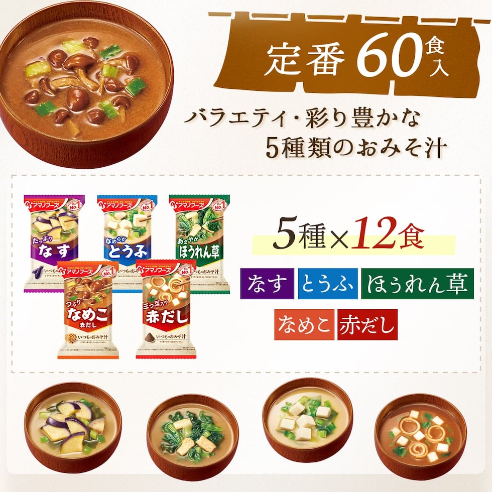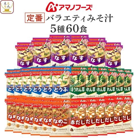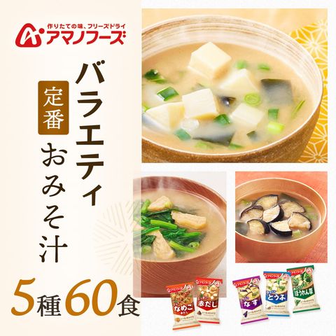 アマノフーズ フリーズドライ 味噌汁 いつものおみそ汁 5種60食 詰め合わせ セット 【 送料無料 】 インスタント味噌汁 即席 味噌汁の具 なす とうふ なめこ ほうれん草 赤だし みそ汁 食品 プレゼント 備蓄 非常食 ホワイトデー 2026 母の日 ギフト