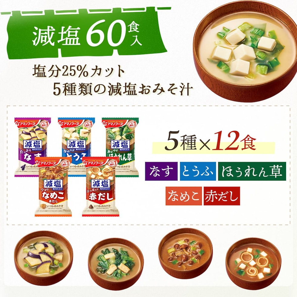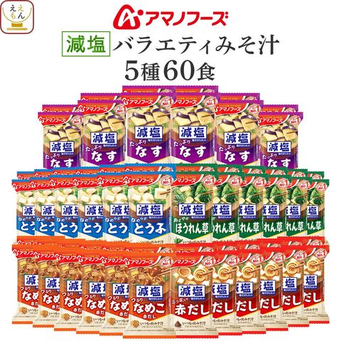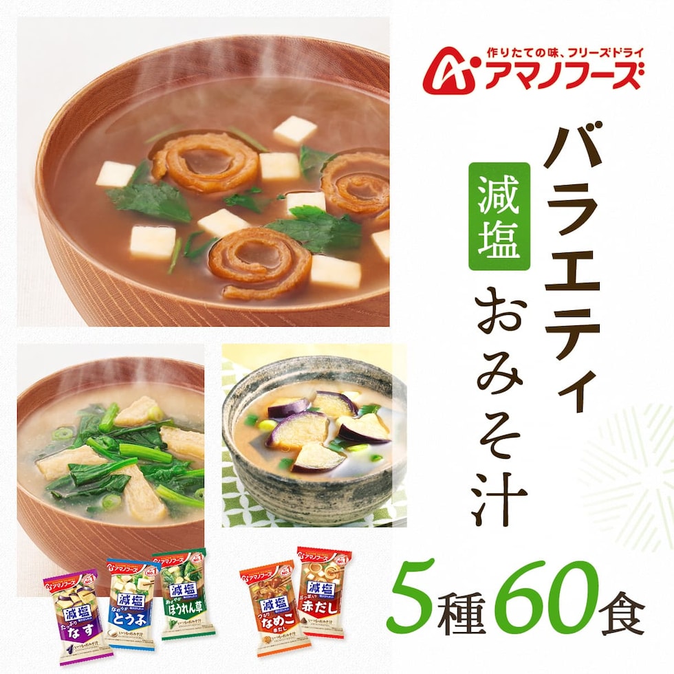 アマノフーズ フリーズドライ 味噌汁 減塩 いつものおみそ汁 5種60食 詰め合わせ セット 【 送料無料 】 インスタント味噌汁 即席 減塩味噌汁 味噌汁の具 なす とうふ なめこ ほうれん草 赤だし みそ汁 備蓄 非常食 ホワイトデー 2026 母の日 ギフト