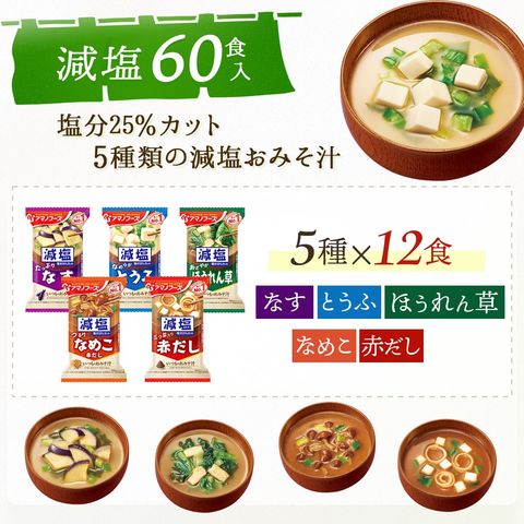 ■ 減塩 いつものおみそ汁 減塩なす 9g 減塩とうふ 10.3g 減塩ほうれん草 6.8g 減塩なめこ 赤だし 8g 減塩赤だし 三つ葉入り 8g 5種 各12食 合計60食 |