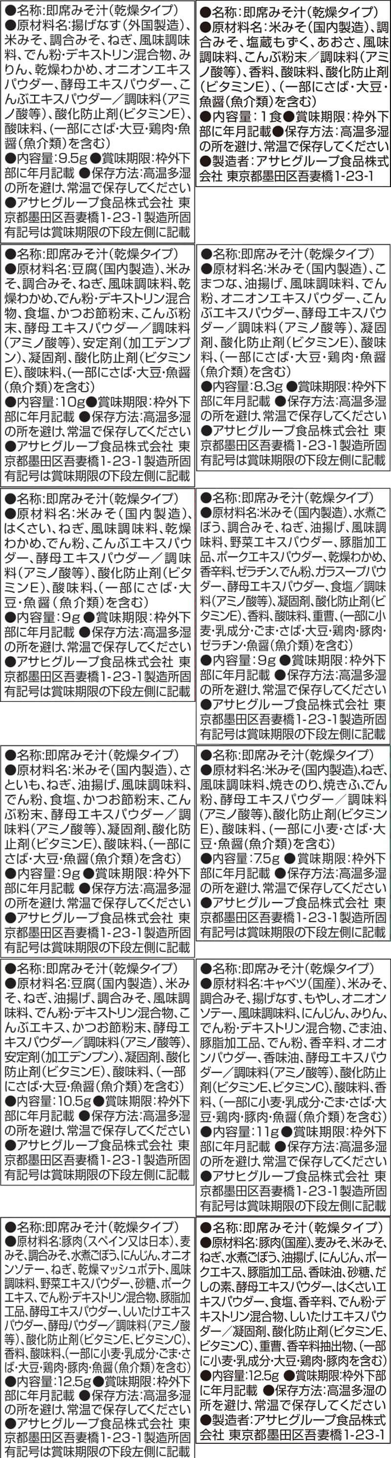 ■ いつものおみそ汁 なす 9.5g あおさ 8.2g とうふ 10g 小松菜 8.3g 白菜 9g ごぼう 9g 里いも 9g ■ いつものおみそ汁 贅沢 海苔 7.5g とうふ 10.5g 炒め野菜 11g 豚汁 12.5g ■ 旨だし おみそ汁 豚汁 12.5g 各1食 ■ うちのおみそ汁 5食入 なすとお揚げ 44g あさりとわかめ 31g 各1袋 14種 22食 |
