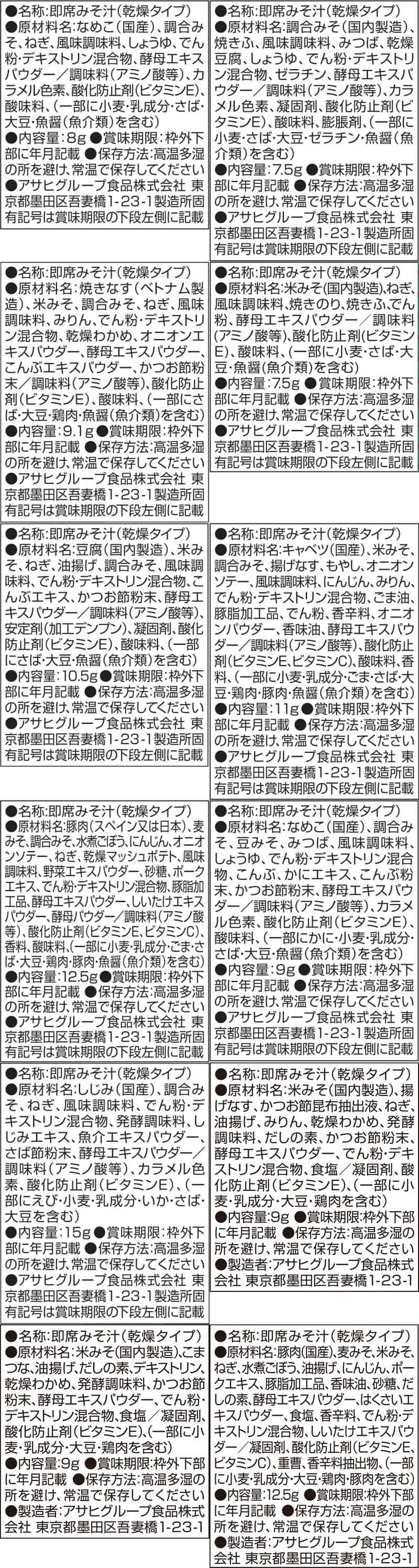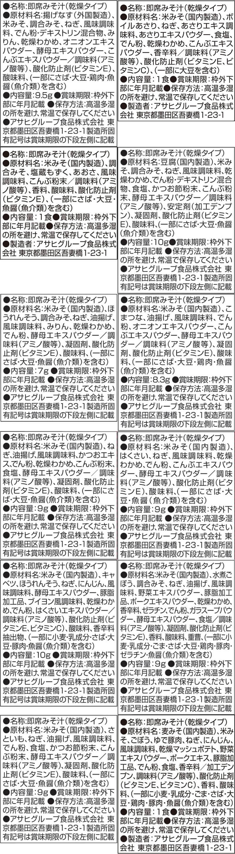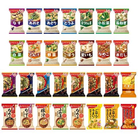 ■ いつものおみそ汁 なす 9.5g あさり 7.4g あおさ 8.2g とうふ 10g ほうれん草 7g 小松菜 8.3g 長ねぎ 9g 白菜 9g 野菜 10g ごぼう 9g 里いも 9g とん汁 10.5g なめこ 赤だし 8g 赤だし 三つ葉入り 7.5g ■ いつものおみそ汁 贅沢 焼なす 9.1g 海苔 7.5g とうふ 10.5g 炒め野菜 11g 豚汁 12.5g なめこ 9g しじみ 赤だし 15g ■ 旨だし おみそ汁 なす汁 合わせ 9g こまつ菜 合わせ 9g 豚汁 12.5g なめこ 合わせ 8g なめこ 赤だし 8g ■ Theうまみ たまごスープ 11g ■ Theうまみ ごはんがうまい! 特製たまごスープ 7.0g スパイスカレースープ 8.7g 旨辛チゲスープ 8.9g 30種 30食 |