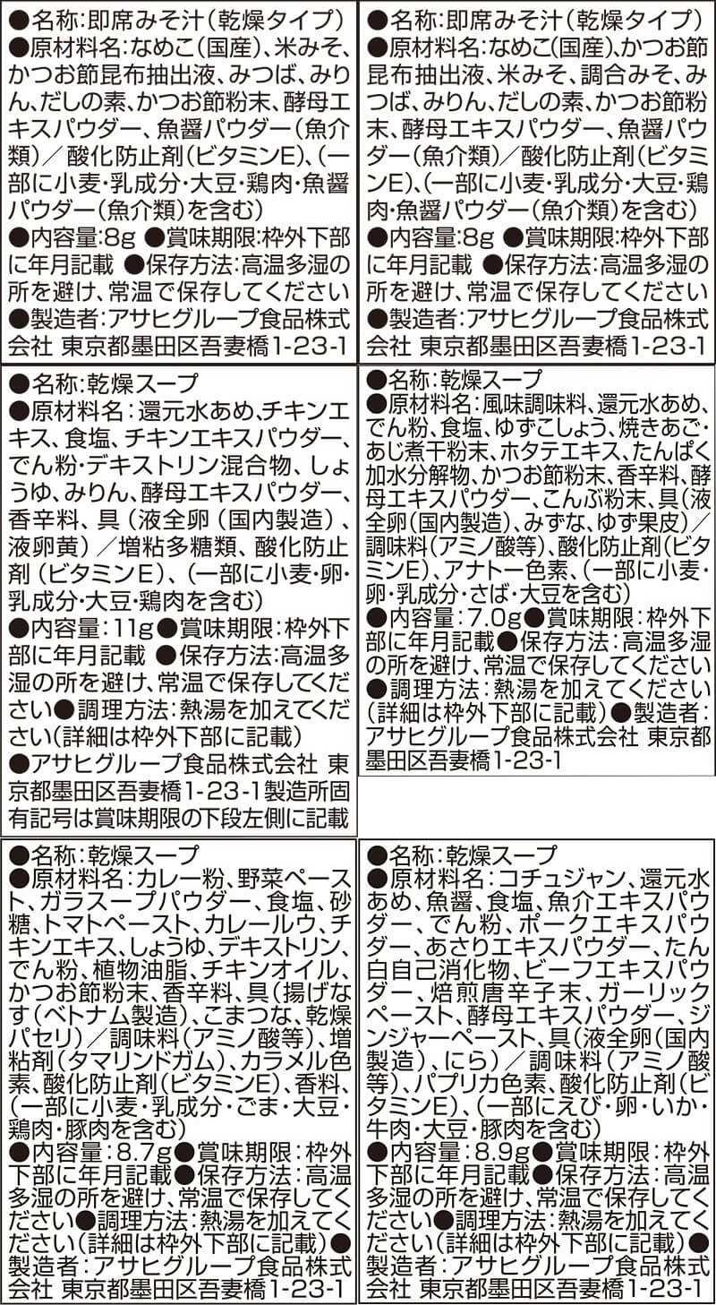 ■ Theうまみ 揚げなすの完熟トマトスープ 10g 3種のねばねば具材の和風スープ 5g 粒コーンとポテトのポタージュ 19.8g 3種のきのこの豆乳スープ 9.3g ■ 旨だし スープ あおさスープ 5.5g のりスープ 6g もずくスープ 4.5g |