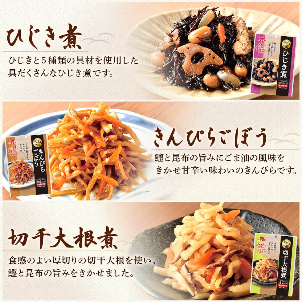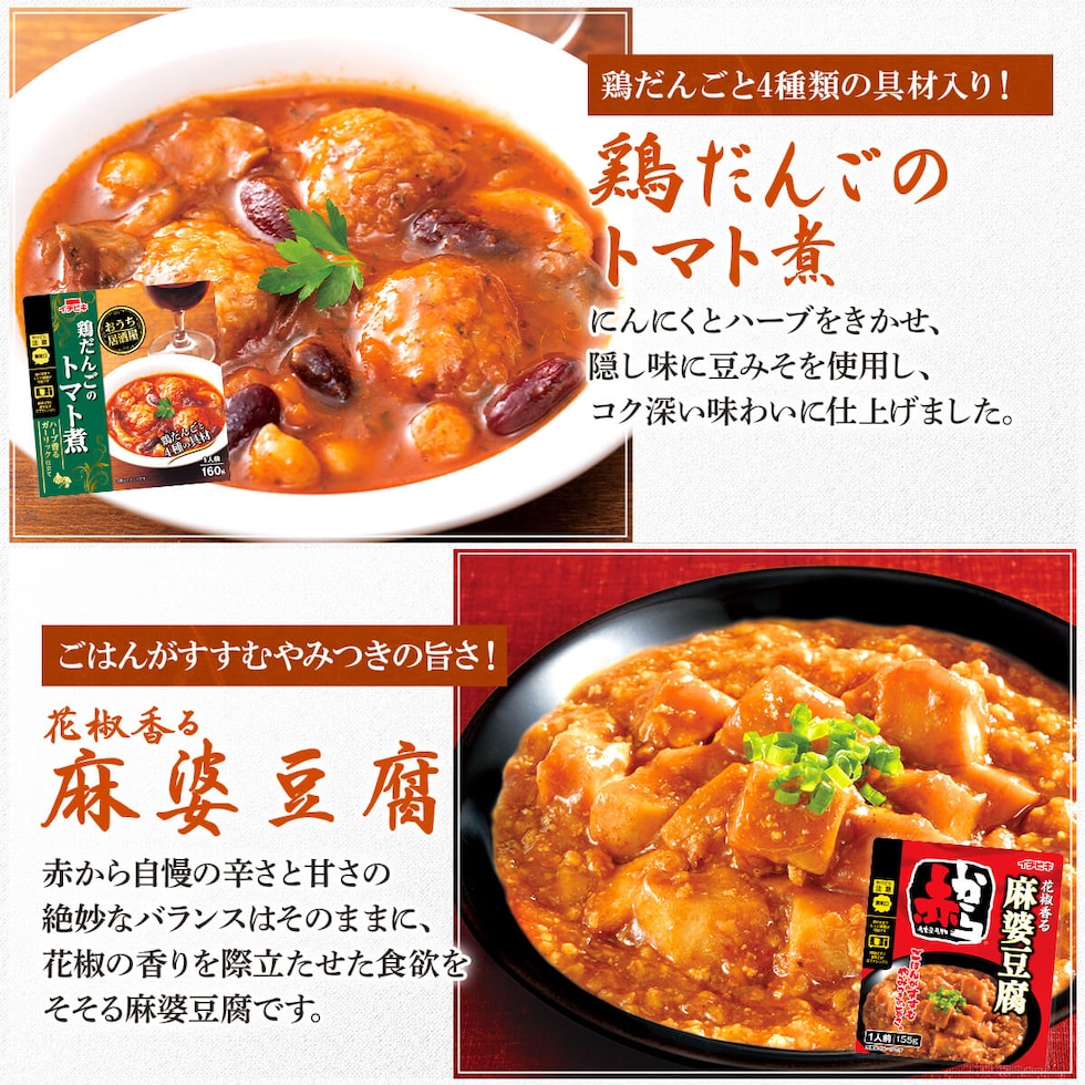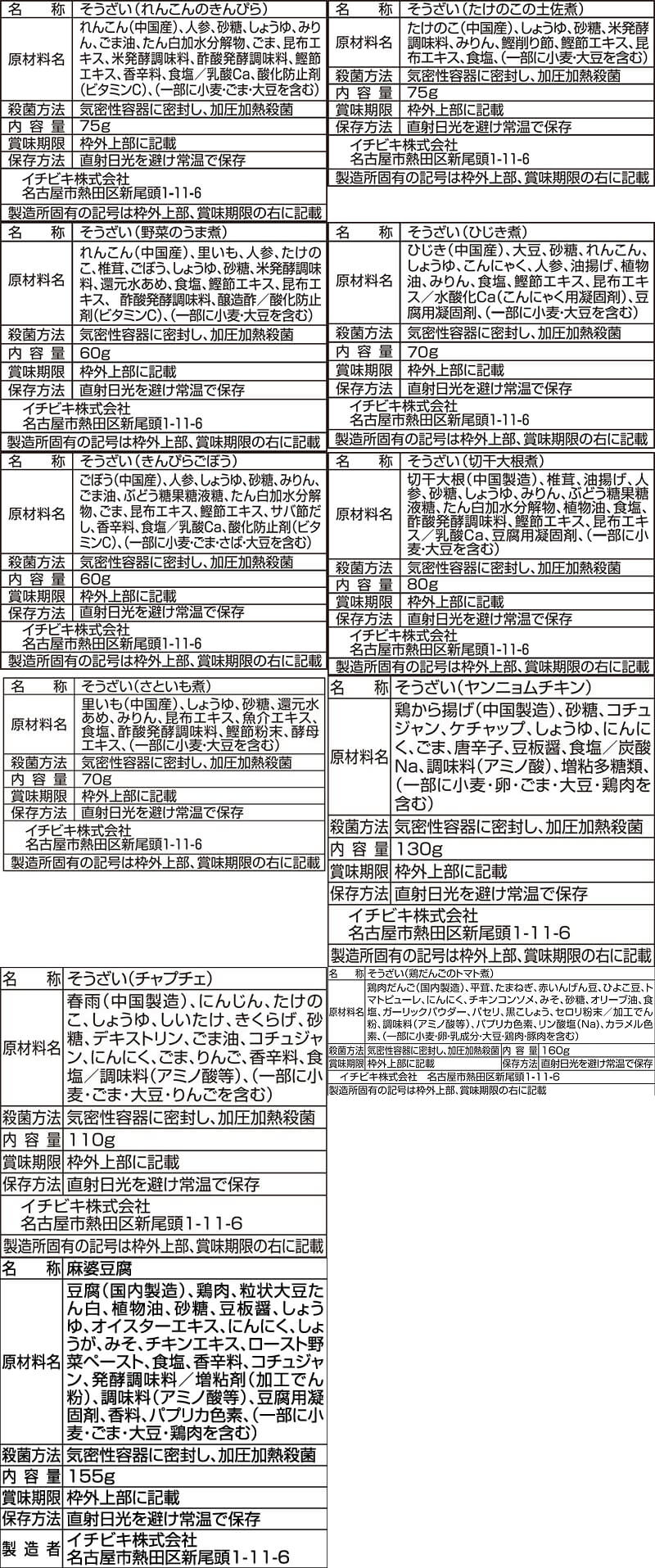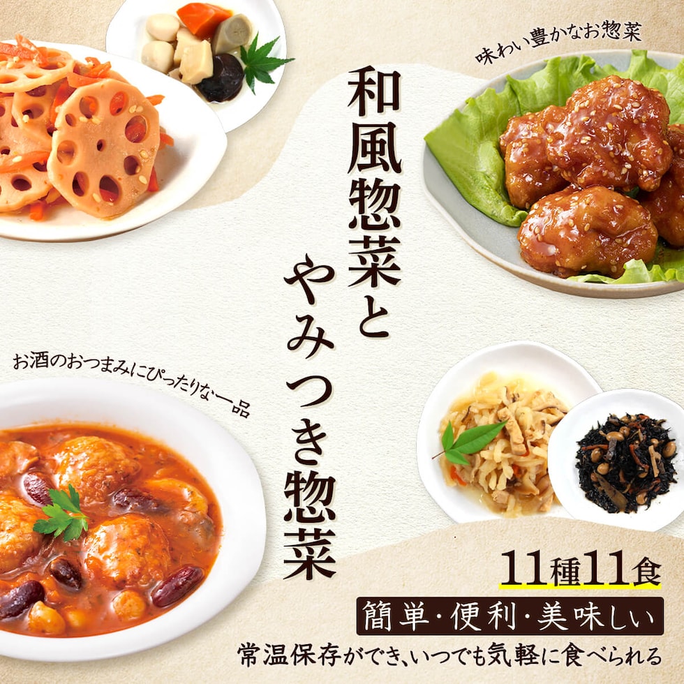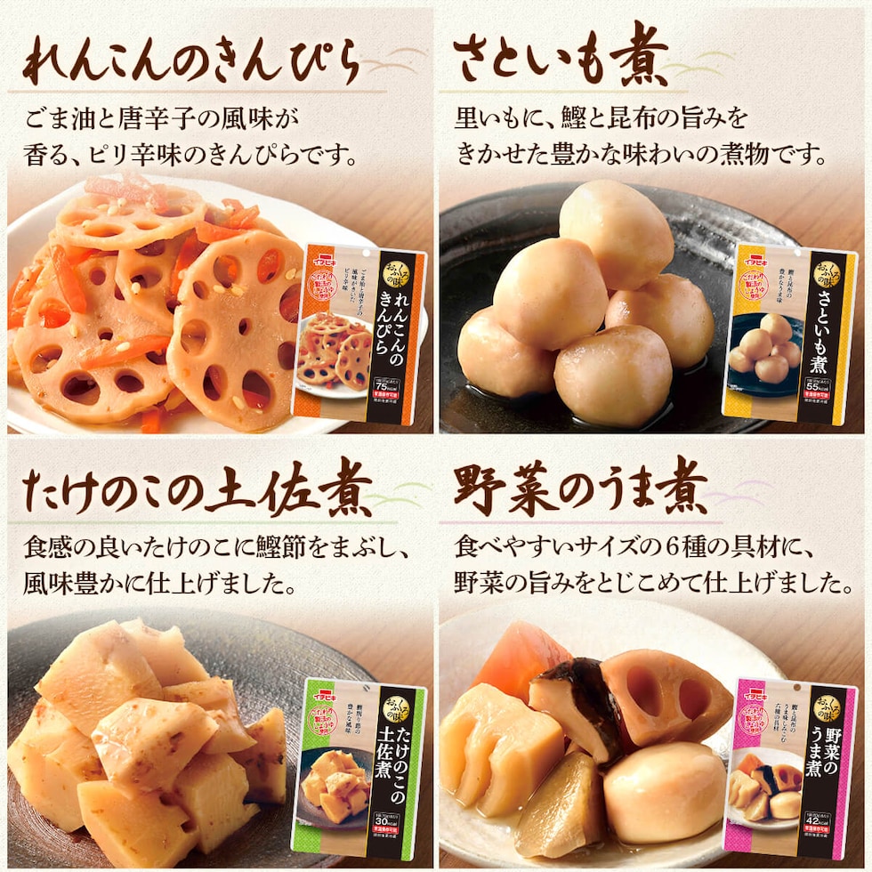 ■ おふくろの味 れんこんのきんぴら 75g たけのこの土佐煮 75g 野菜のうま煮 60g ひじき煮 70g きんぴらごぼう 60g 切干大根煮 80g さといも煮 70g ■ おうち居酒屋 ヤンニョムチキン 130g チャプチェ 110g 鶏だんごのトマト煮 160g ■ 赤から 赤から麻婆豆腐 155g 11種 11食 |