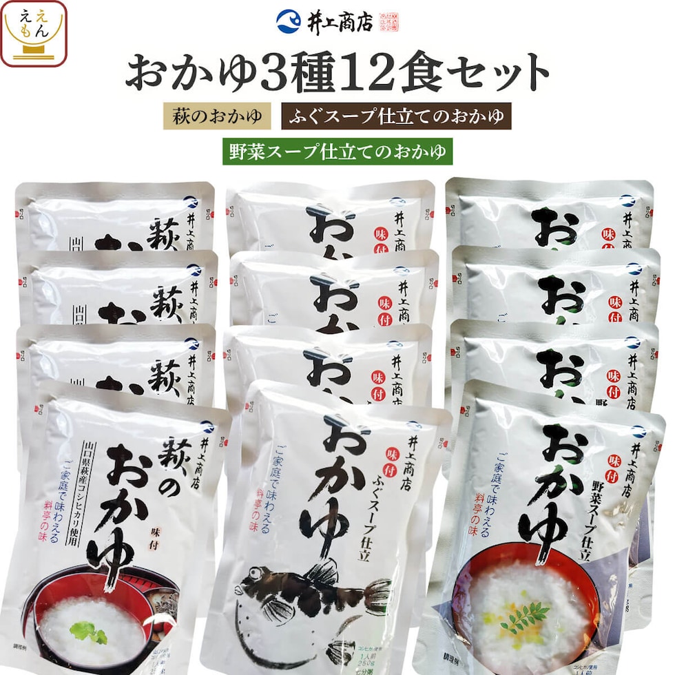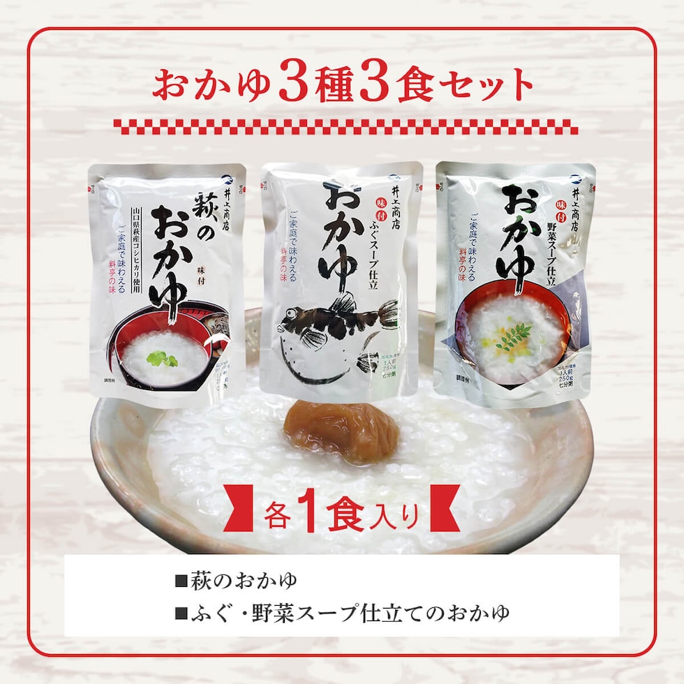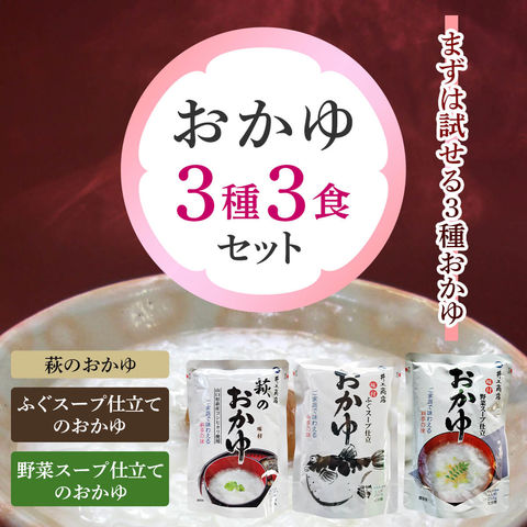 おかゆ レトルト 萩 ふぐ 野菜 スープ お粥 3種3食 詰め合わせ お試し セット 【 メール便 送料無料 】 井上商店 レトルト食品 常温保存 国産米 コシヒカリ 一人暮らし 仕送り 高齢者 食べ物 低カロリー 非常食 ホワイトデー 2026 母の日 お返し