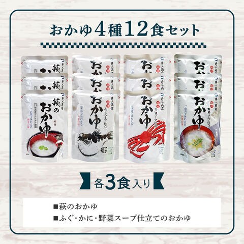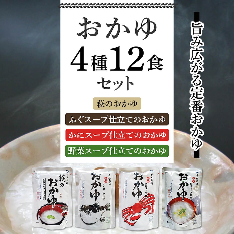 おかゆ レトルト 萩 ふぐ かに 野菜 スープ お粥 詰め合わせ 4種12食 セット 【 送料無料 】 井上商店 レトルト食品 常温保存 惣菜 国産米 コシヒカリ 一人暮らし 仕送り 高齢者 食べ物 低カロリー 防災 非常食 ホワイトデー 2026 母の日 ギフト