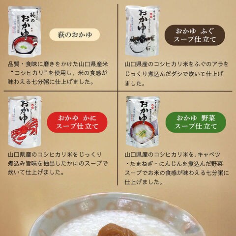 山口県産 国産米 の うるち米 を使用 した おかゆ 4種 12食 詰め合わせ セット お米 の 食感 が 味わえる 七分粥 に ふぐ かに の スープ が優しく かおる風味 や キャベツ/たまねぎ/にんじん を 煮込んだ 野菜スープ 。 子供 にも 高齢者 にも 食べやすい やさしい 味付け アレンジ しても 美味しい。 常温 のままでもOK 湯煎 レンジ で温めるだけで更に 美味しい おかゆ です。 低カロリー で 朝食 や 夜食に 置き換え に おすすめ。