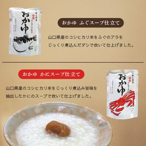 山口県産 国産米 の うるち米 を使用 した おかゆ 2種 24食 詰め合わせ セット お米 の 食感 が 味わえる 七分粥 に 優しく かおる ふぐ かに だし の 風味が更に美味しく 召し上がれます。 子供 にも 高齢者 にも 食べやすい やさしい 味付け アレンジ しても 美味しい。 そのままでも 食べれて レンジ 湯煎 で温める と更に 美味しい 。 低カロリー で 朝食 や 夜食に 置き換え に おすすめ。