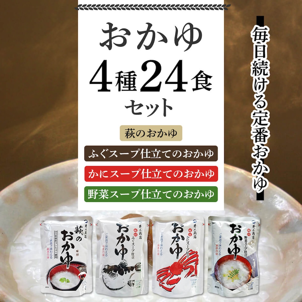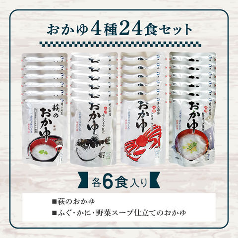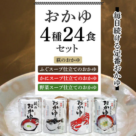 おかゆ レトルト 萩 ふぐ かに 野菜 スープ お粥 詰め合わせ 4種24食 セット 【 送料無料 】 井上商店 レトルト食品 常温保存 惣菜 国産米 コシヒカリ 一人暮らし 仕送り 高齢者 食べ物 低カロリー 防災 非常食 ホワイトデー 2026 母の日 ギフト