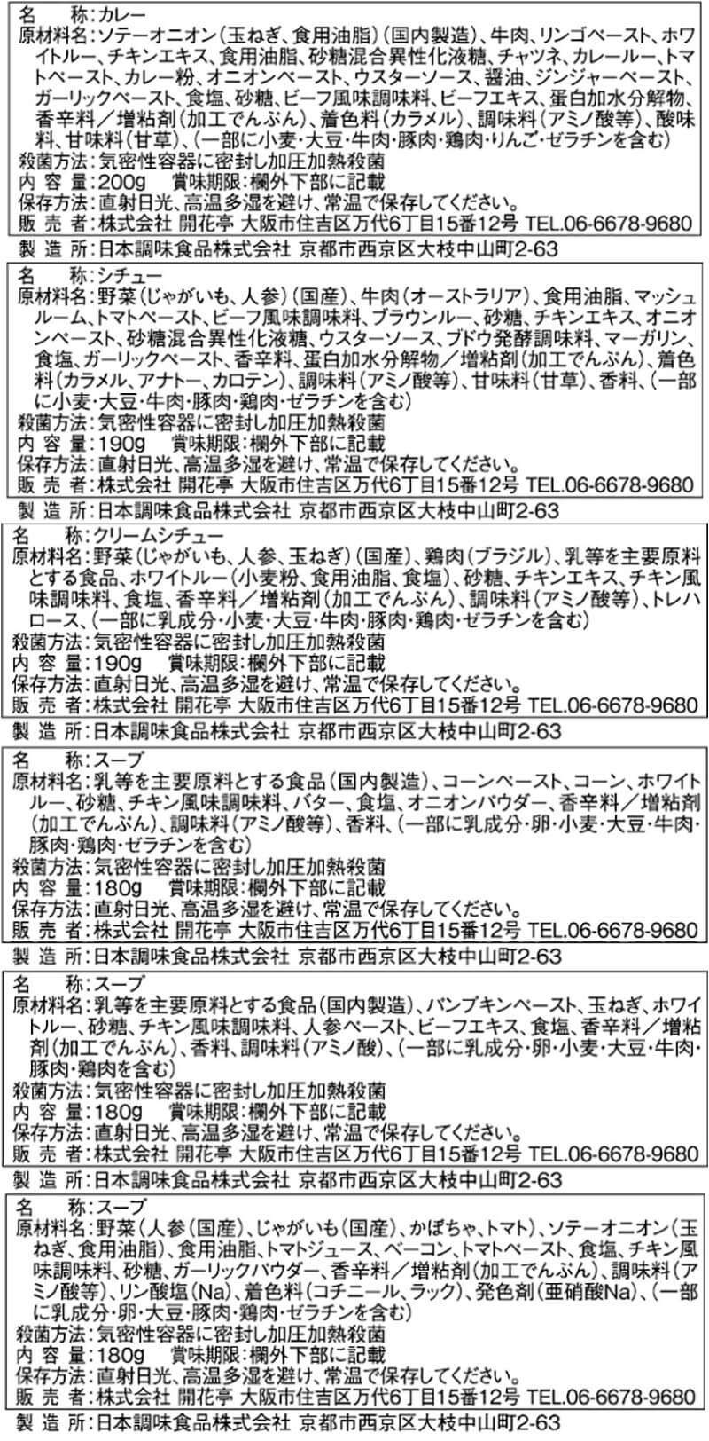 ビーフカレー 200g ビーフシチュー 190g チキンクリームシチュー 190g コーンポタージュスープ 180g パンプキンポタージュスープ 180g ミネストローネ 180g 6種 各2食 合計12食 |