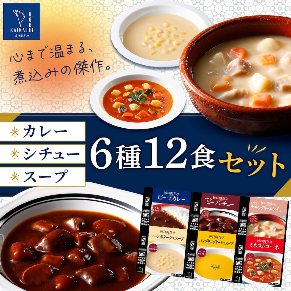母の日 レトルト食品 惣菜 おかず カレー シチュー スープ 6種12食 詰め合わせ セット 【 送料無料 】 神戸開花亭 レトルト 常温保存 高級 洋食 袋のまま レンジ 温めるだけ 一人暮らし 仕送り 備蓄 防災 保存食 非常食 2026 新生活 内祝い ギフト