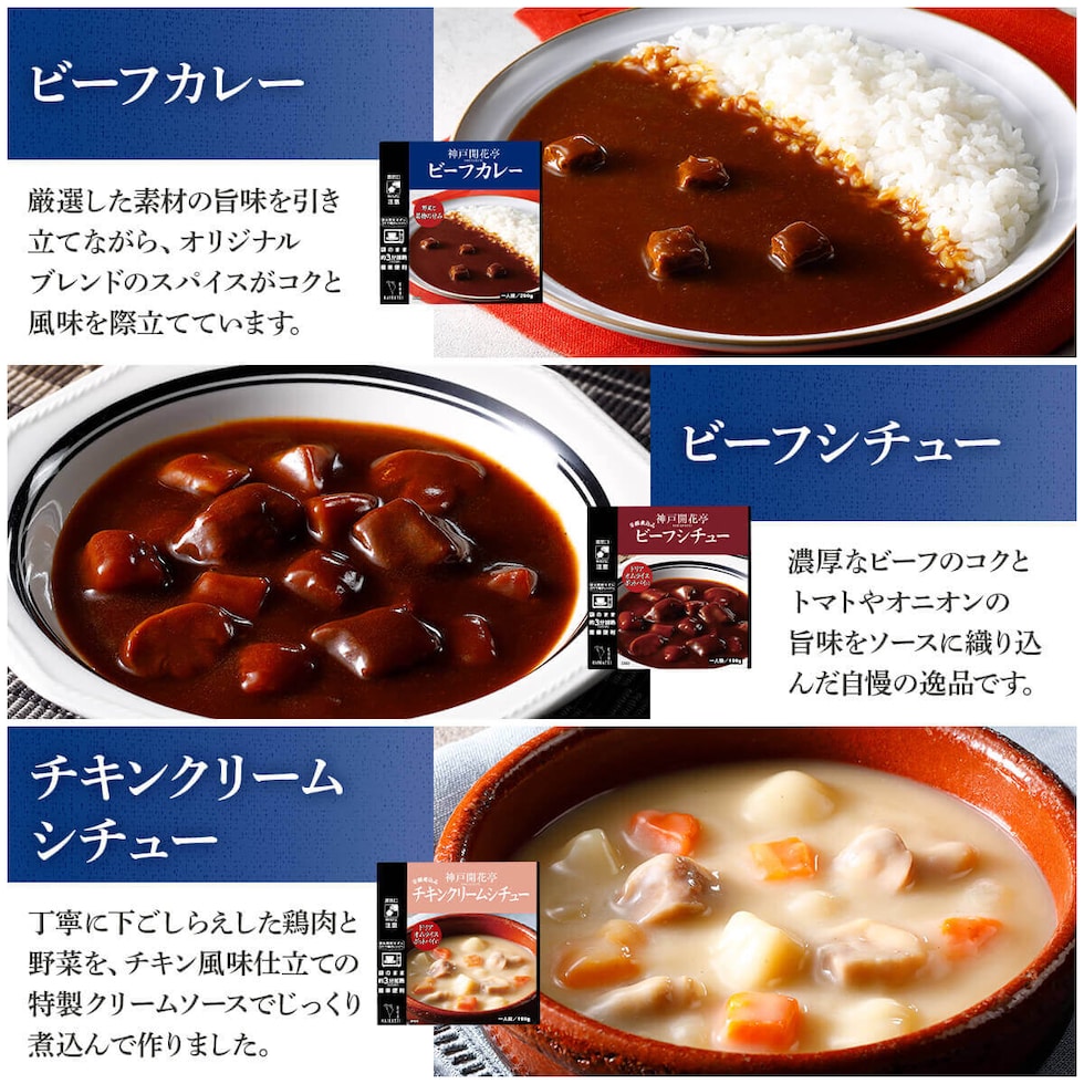 袋のまま レンジ 湯煎 で 温めるだけ レトルト食品 おかず シチュー カレー スープ の 洋食 6種 詰め合わせセット コク と 風味 が絶妙な レトルトカレー 、ビーフカレー 1種。 じっくり 煮込んだ レトルトシチュー は、 ビーフシチュー チキンクリームシチュー の2種。 素材 の味を活かした レトルトスープ は、 コーンポタージュ パンプキンポタージュ ミネストローネ の3種。 神戸開花亭 一流シェフの味 本格 洋風 煮込み料理 をお届けいたします。