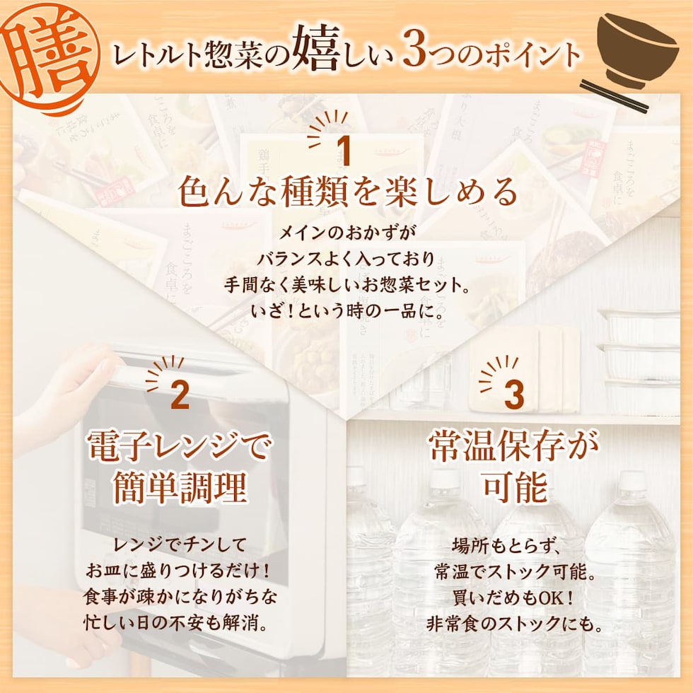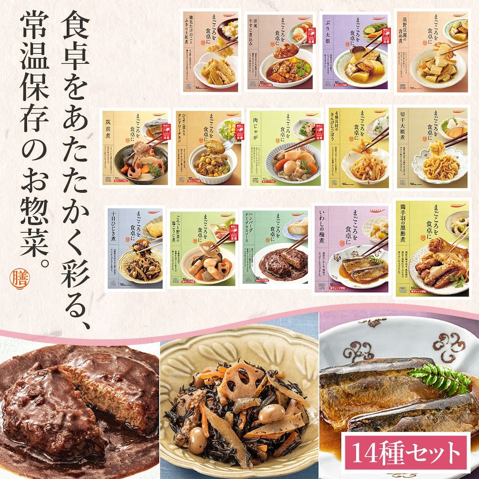 tabete まごころを食卓に 膳 シリーズ 詰め合わせ 14種類の 人気 レトルト食品 が入った 惣菜セット 野菜 肉 魚 煮物 おばんざい や 煮魚 ハンバーグ 肉じゃが 牛すじ煮込み など 和食 洋食 主菜 副菜 と様々な料理のレパートリーが豊富。 レンジ 湯煎 で温めると出来立ての味わいをご賞味いただけます。 袋のまま 電子レンジ で温められる レンジ対応 パウチもございます。 いつでも お手軽 簡単 調理 で 忙しい時の 時短 ごはん に最適。 毎日の ごはん や お弁当 の おかず も困りません。